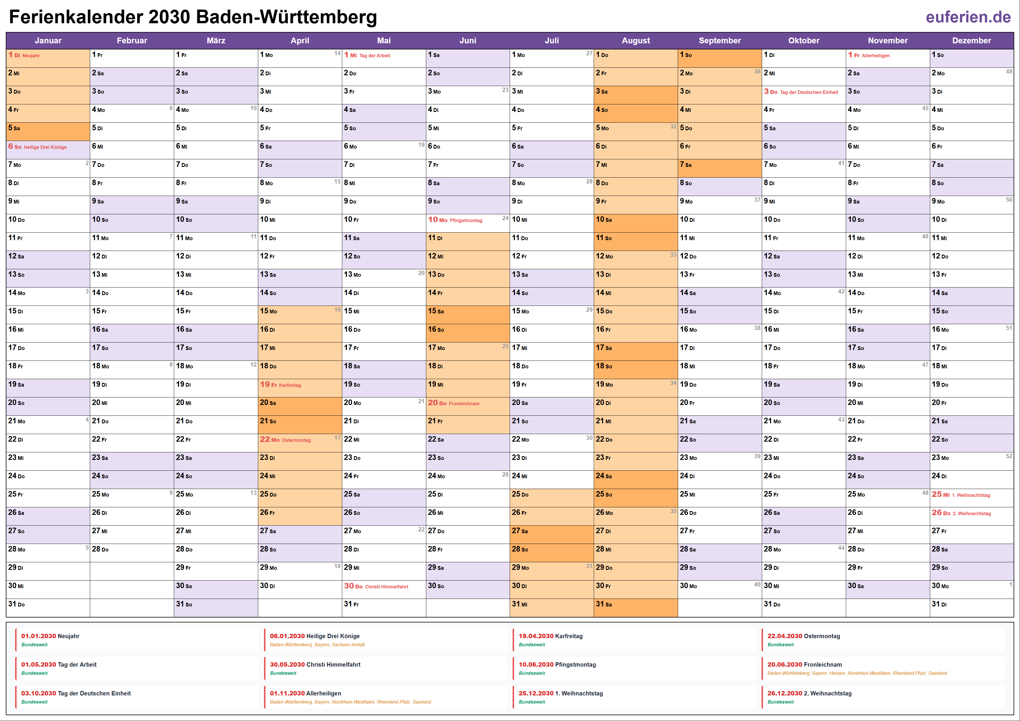 Ferienkalender Baden-Württemberg 2030 herunterladen