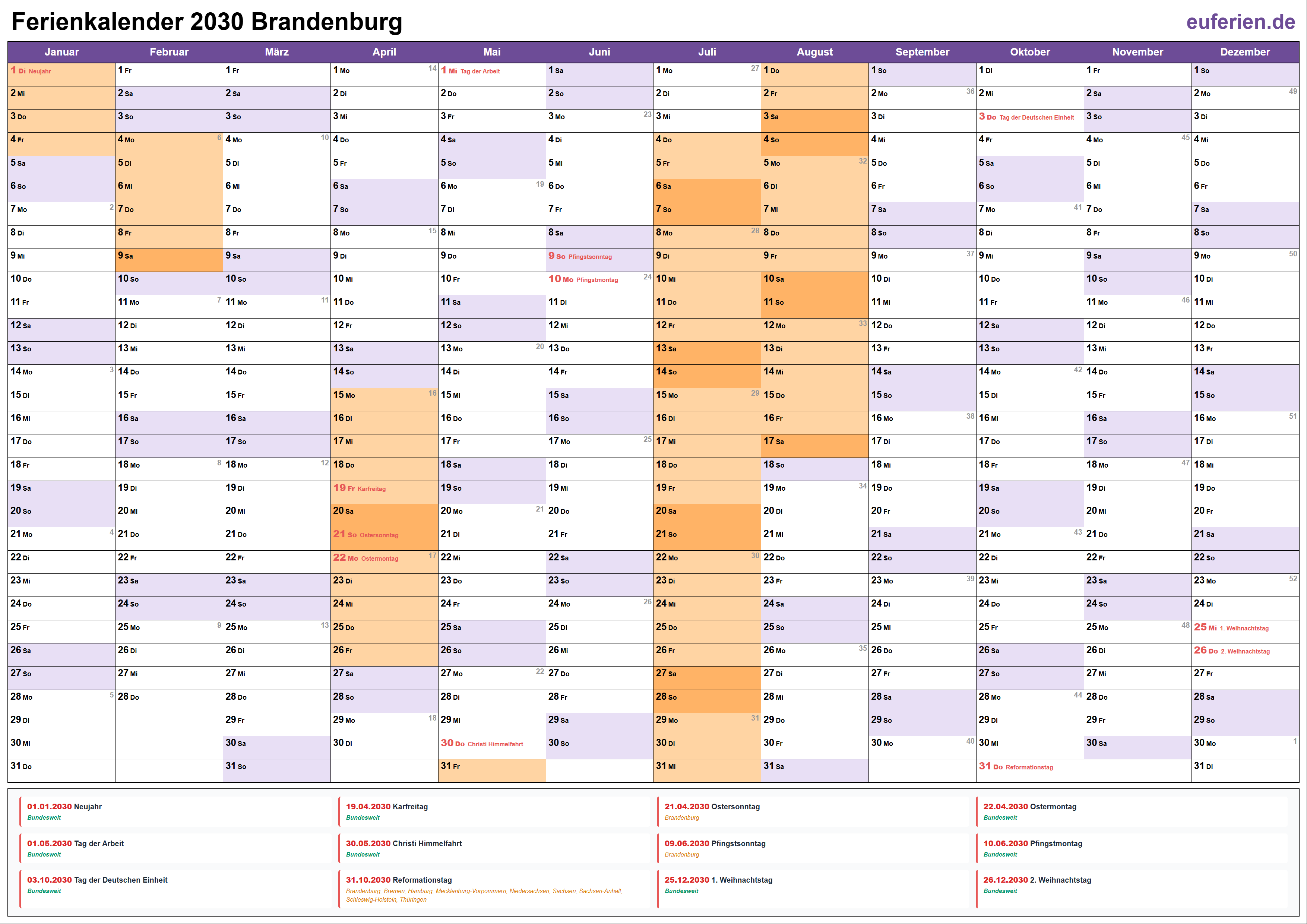 Schulferien, Feiertage und Ferien in Brandenburg im Jahr 2030 im Überblick