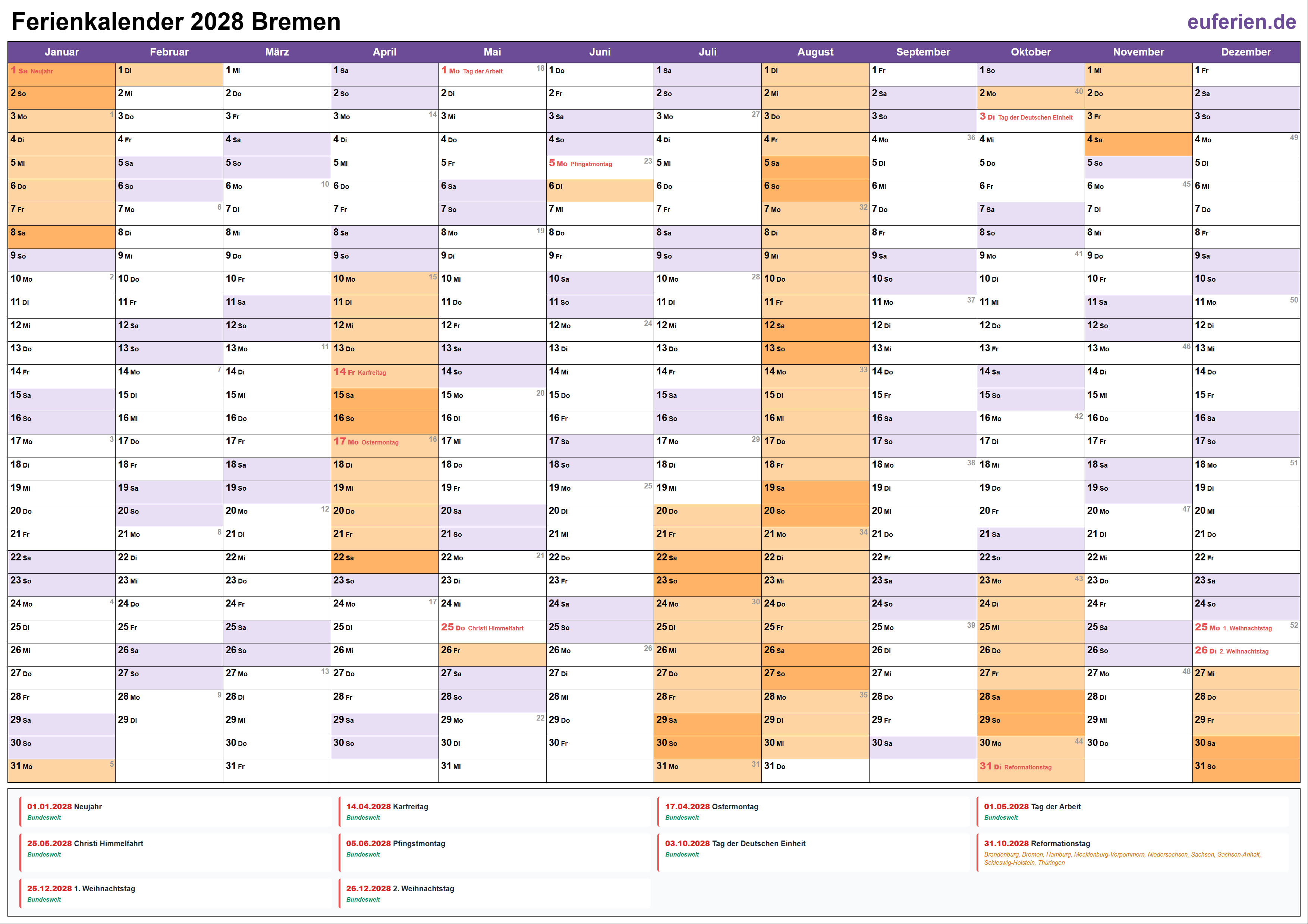 Schulferien und Feiertage in Bremen 2028