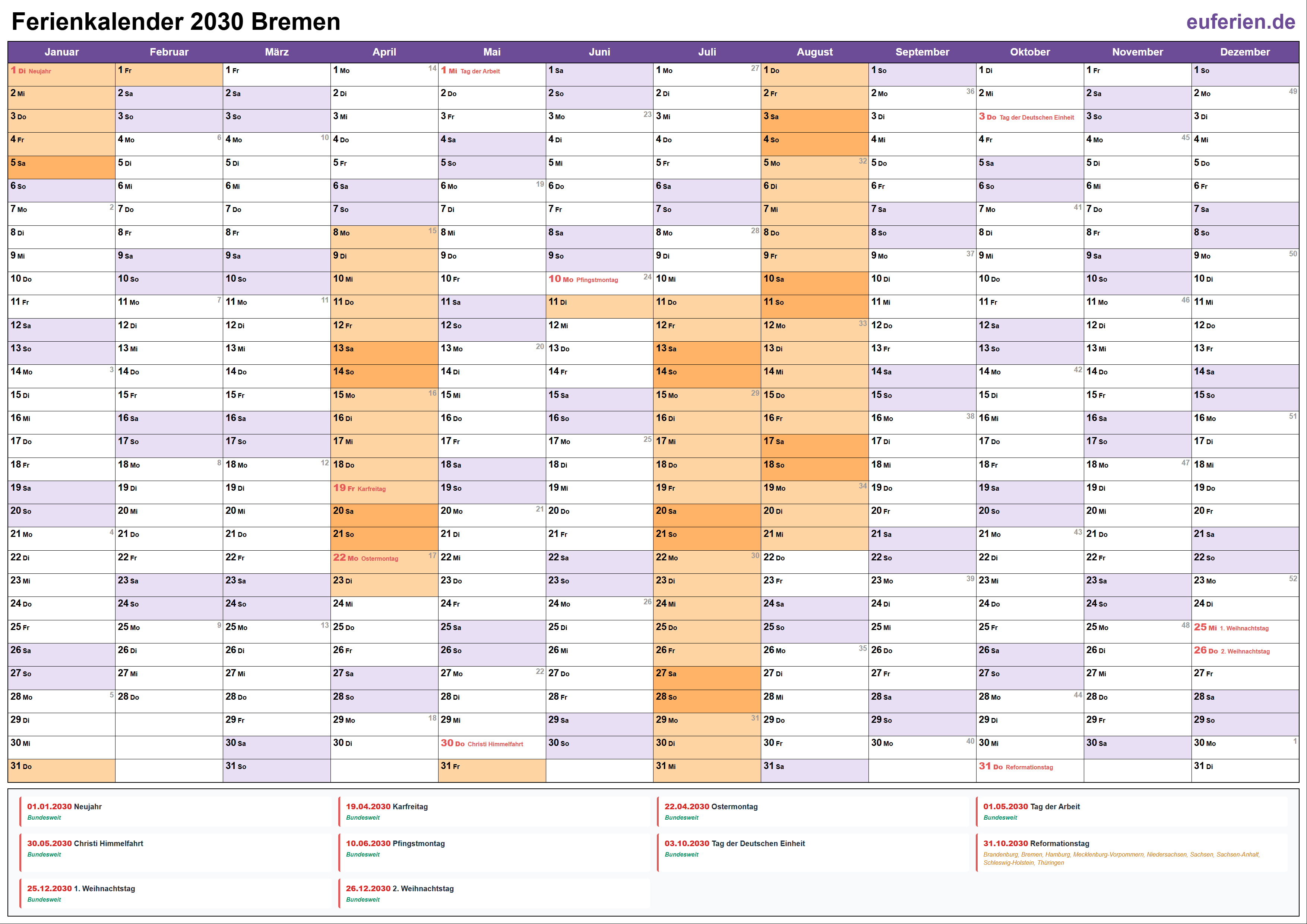 Schulferien, Feiertage und Ferien in Bremen im Jahr 2030 im Überblick