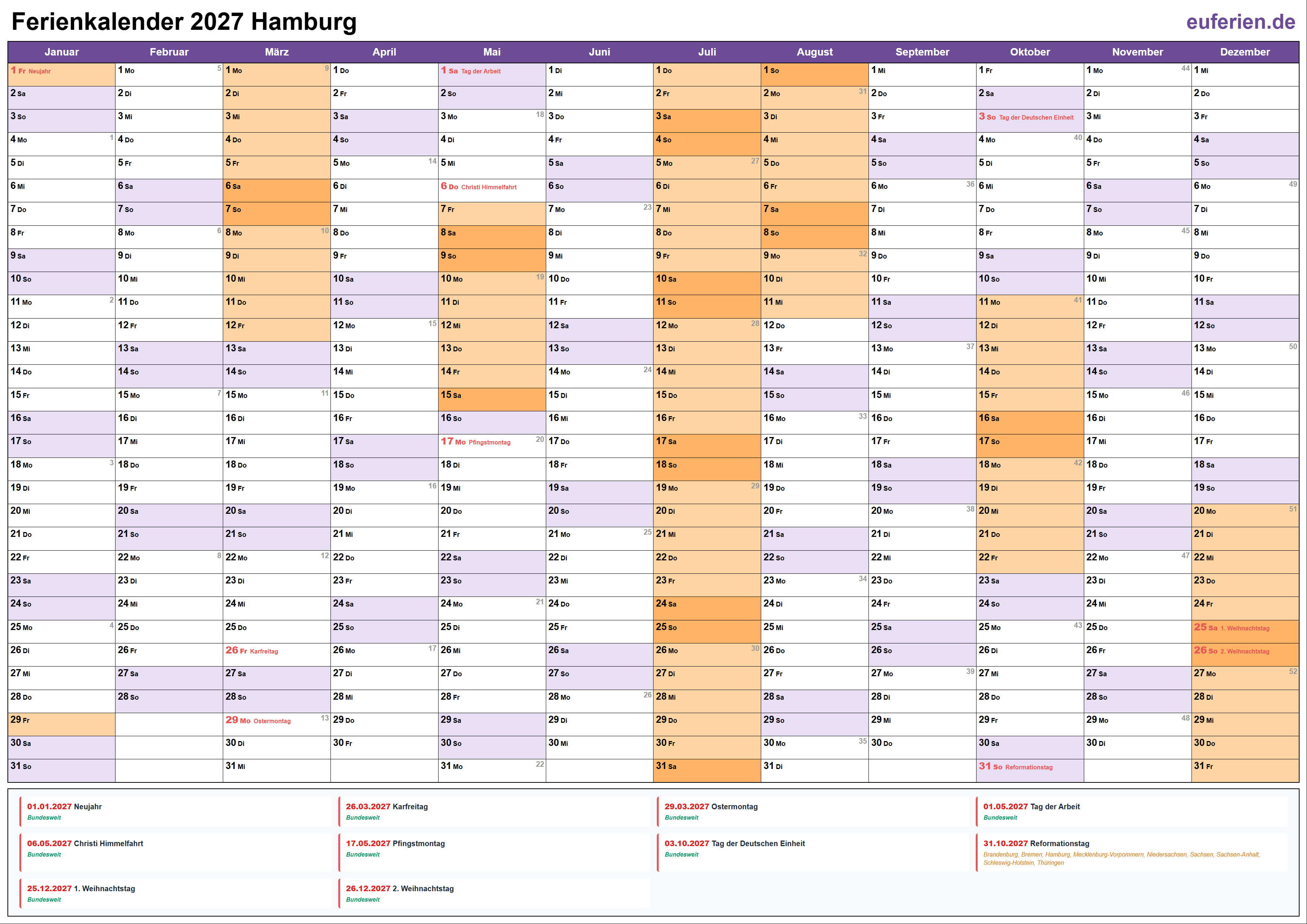 Schulferien und Feiertage in Hamburg 2027
