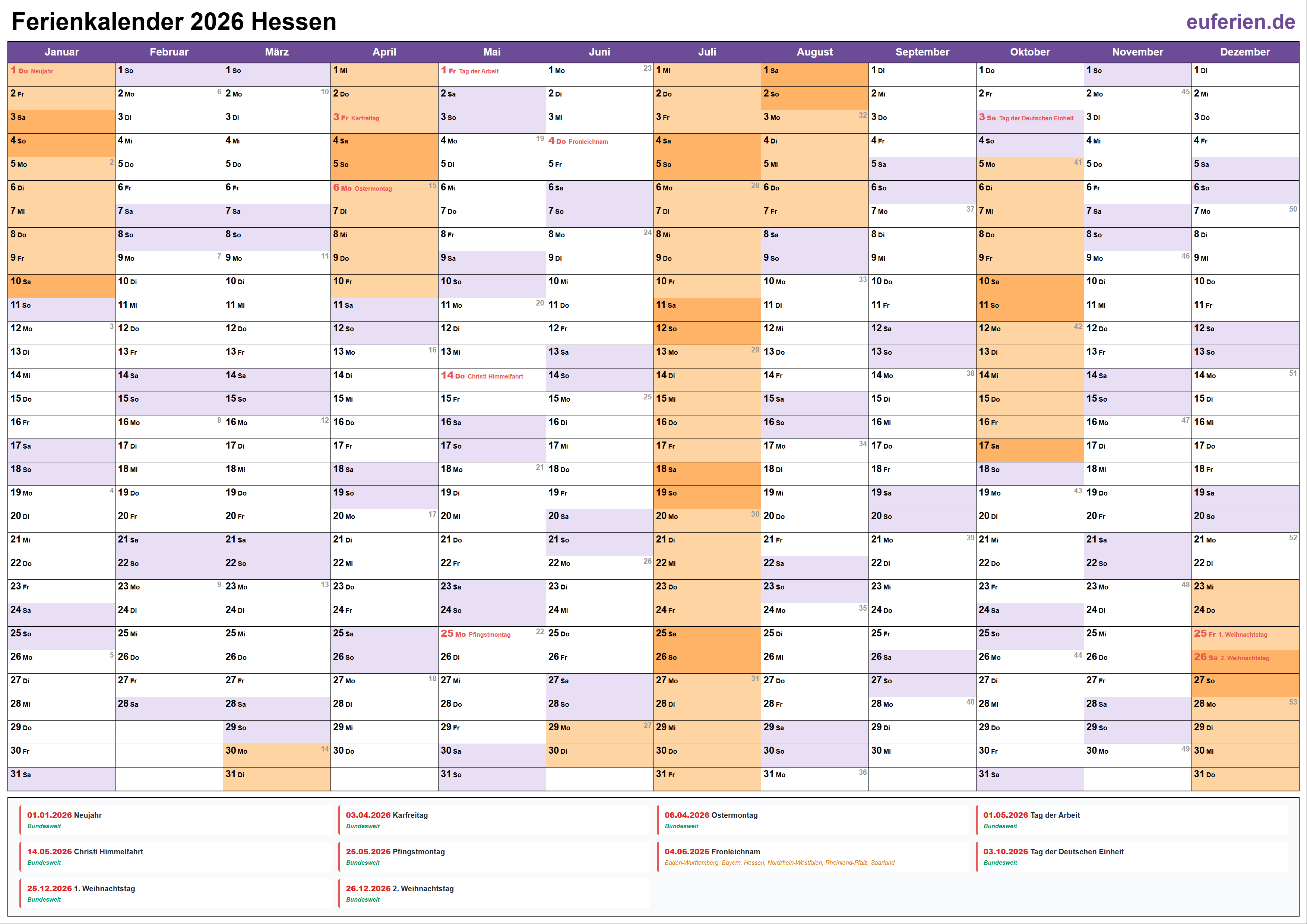 Kalender 2026 mit Schulferien und Feiertagen