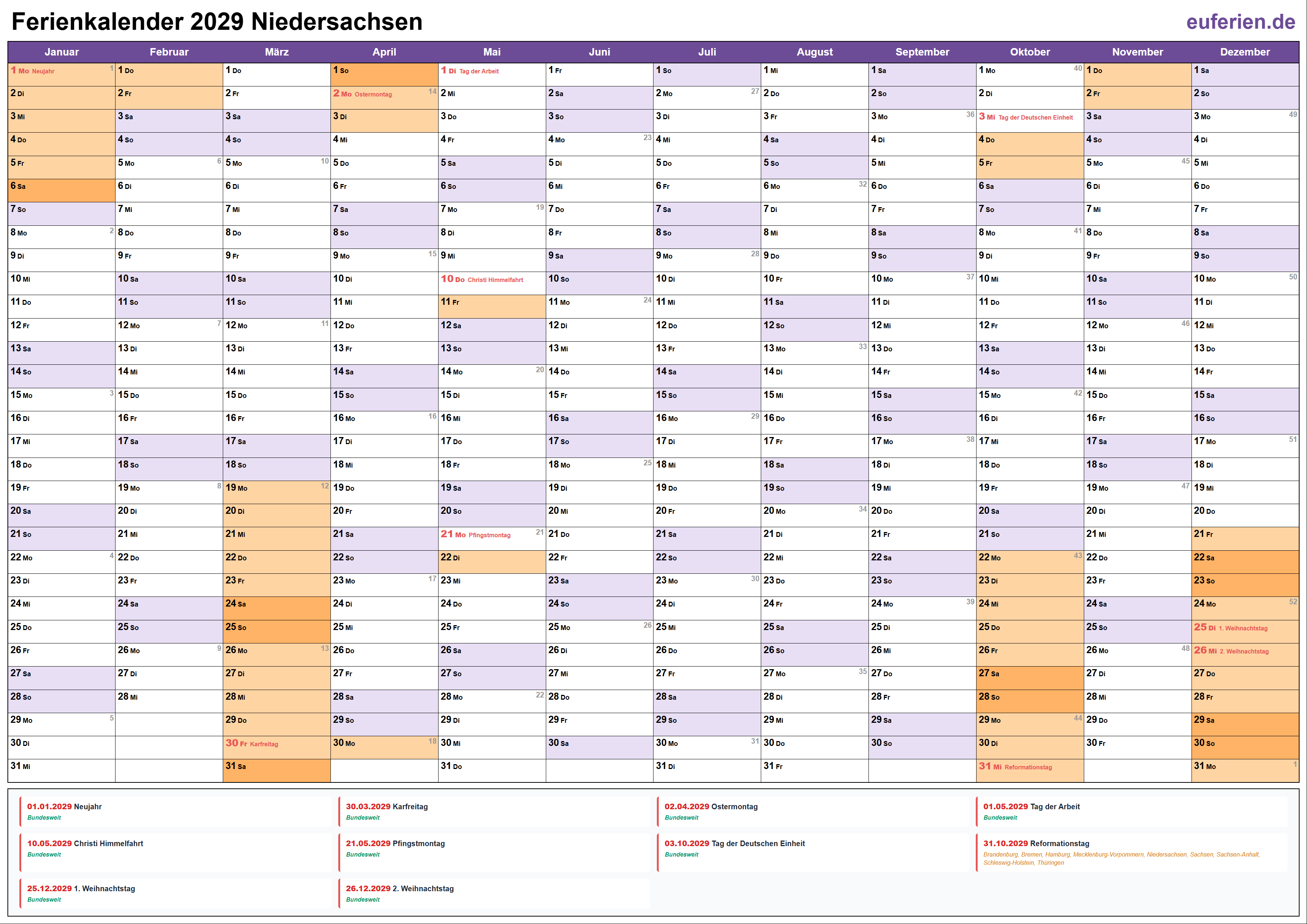 Gesetzliche Feiertage Niedersachsen 2029