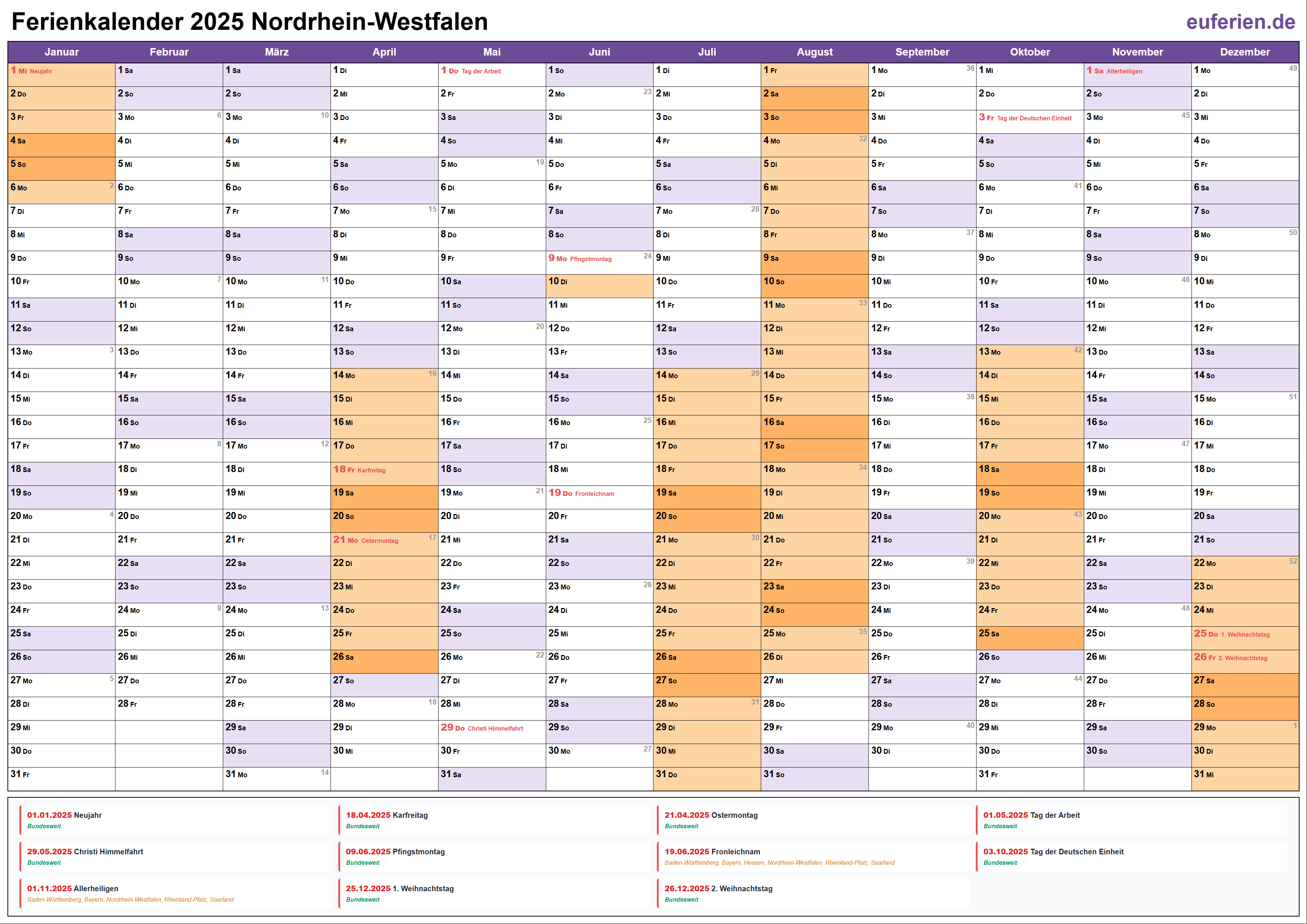 Ferienkalender Nordrhein-Westfalen 2025 herunterladen