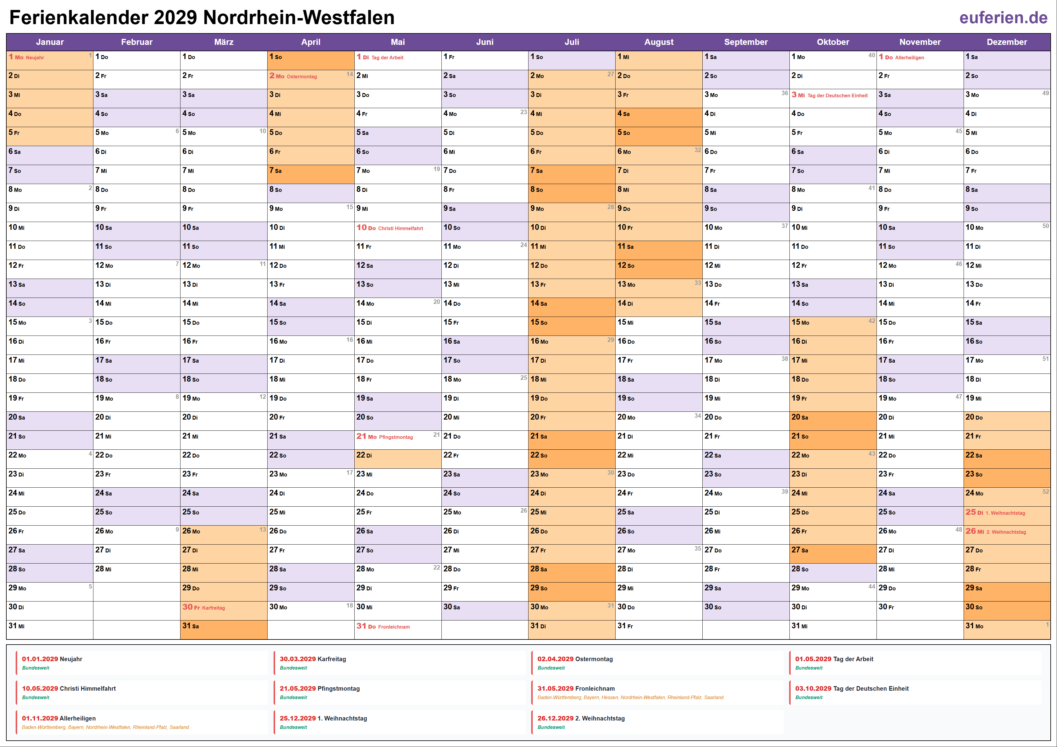 Schulferien, Feiertage und Ferien in Nordrhein-Westfalen im Jahr 2029 im Überblick