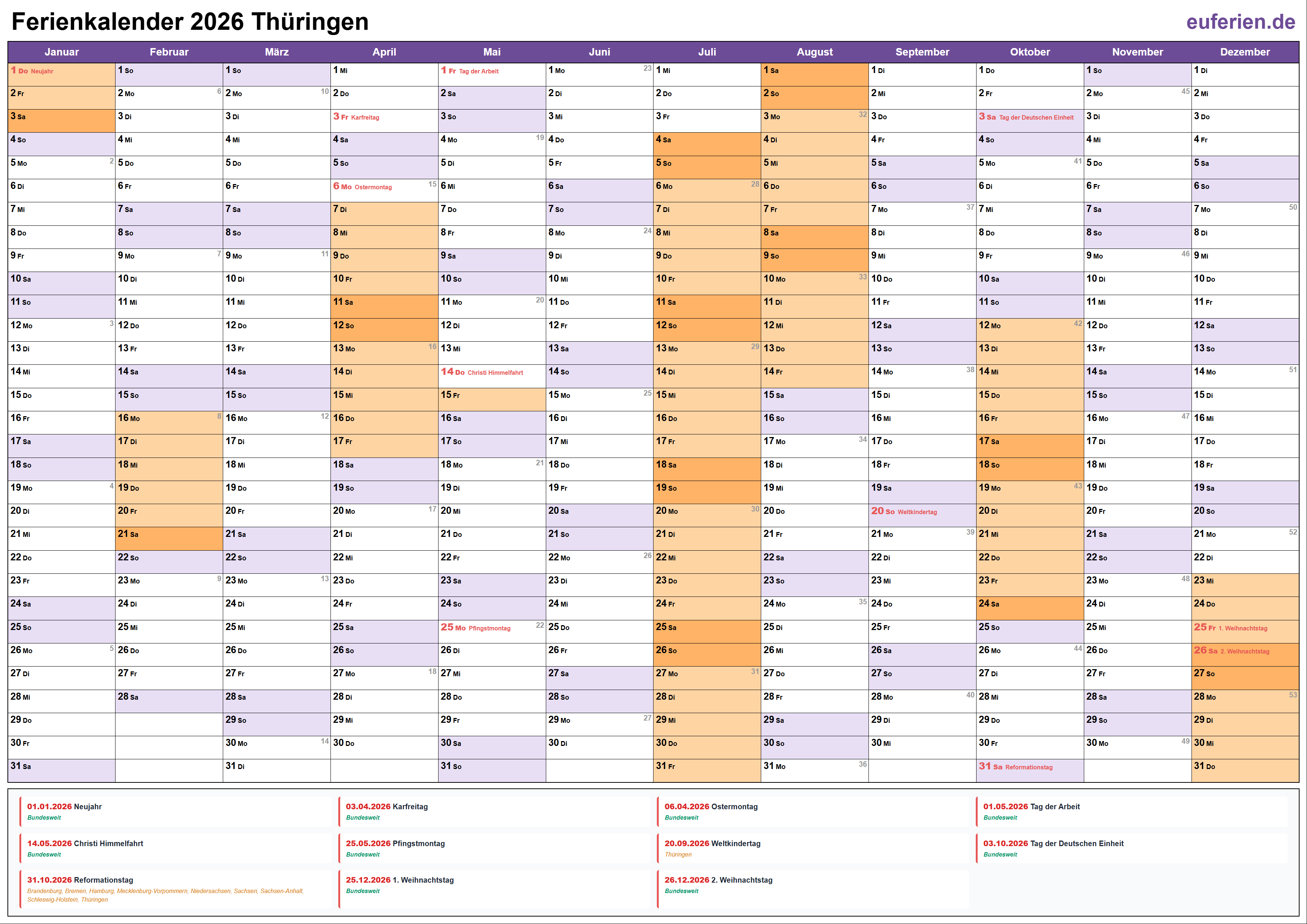 Ferienkalender Thüringen 2026 herunterladen