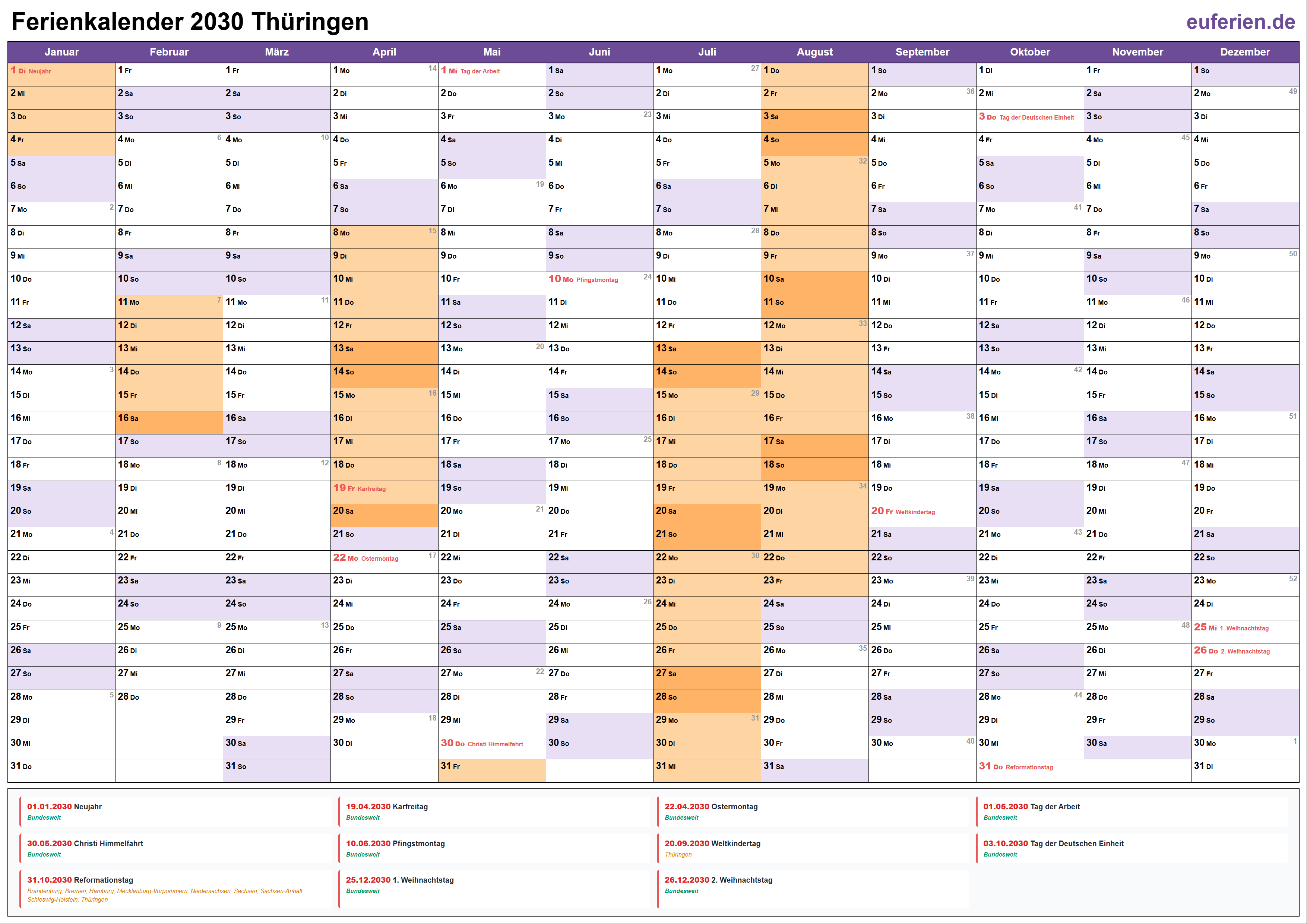 Schulferien, Feiertage und Ferien in Thüringen im Jahr 2030 im Überblick