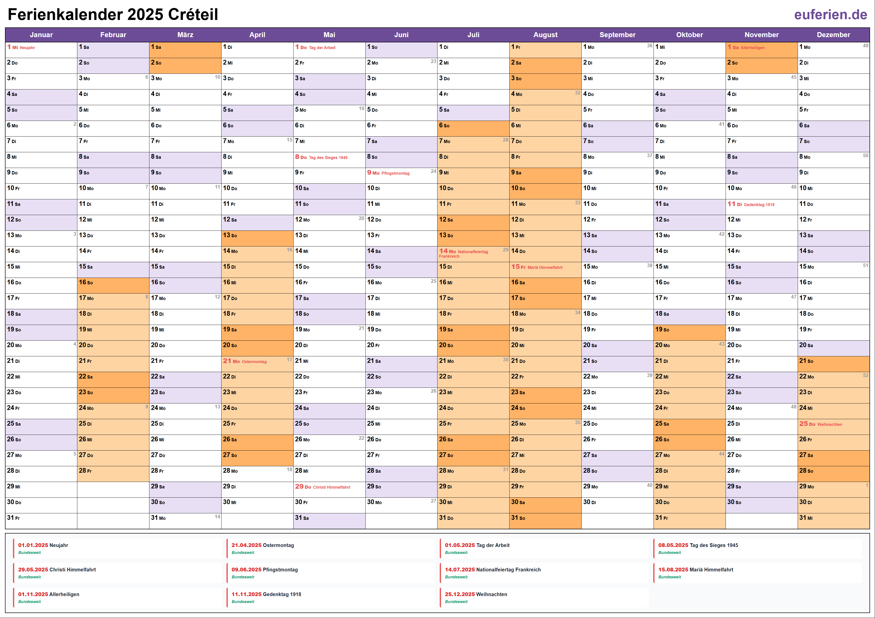 Ferienkalender Créteil 2025 herunterladen