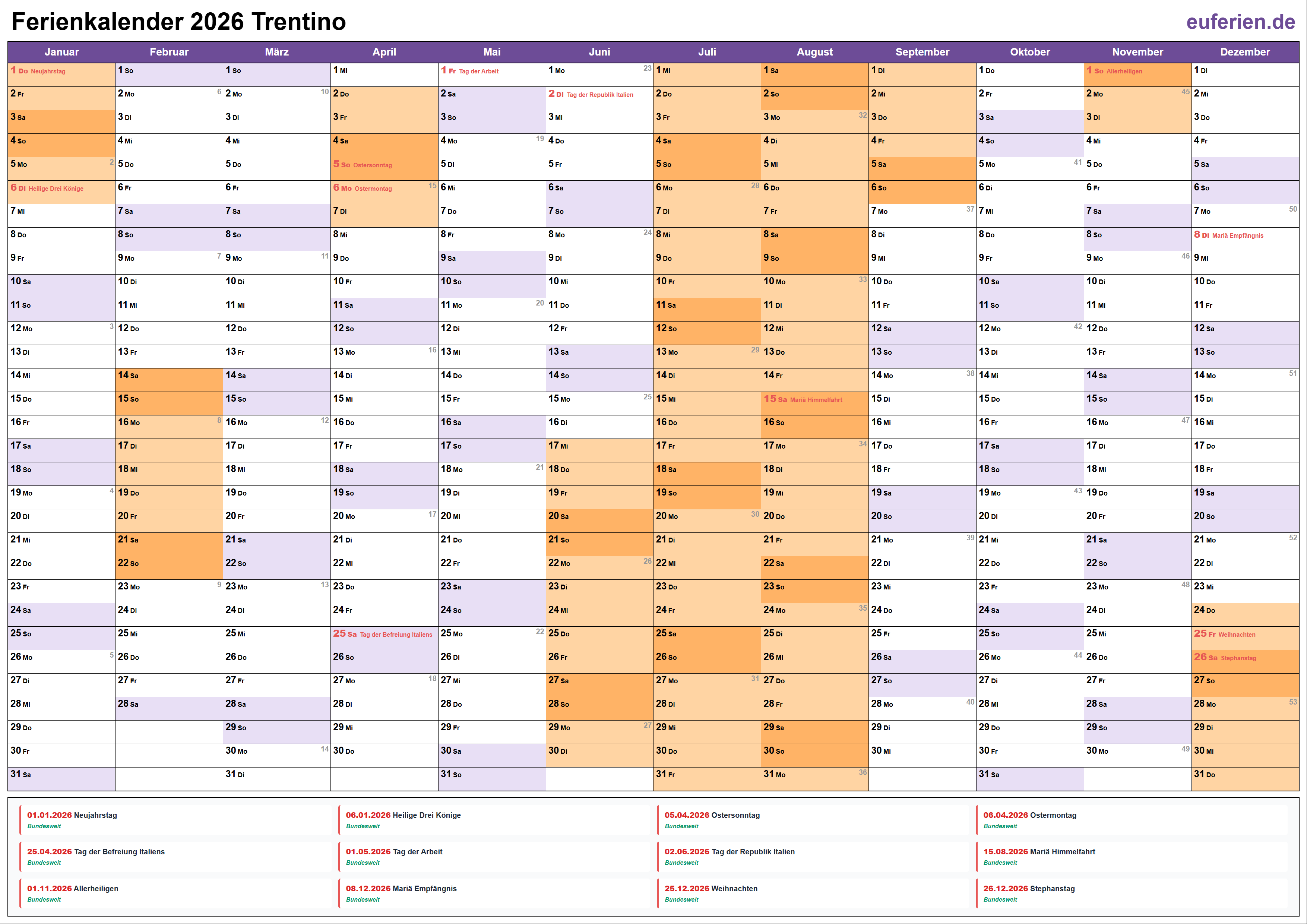 Ferienkalender Trentino 2026 herunterladen