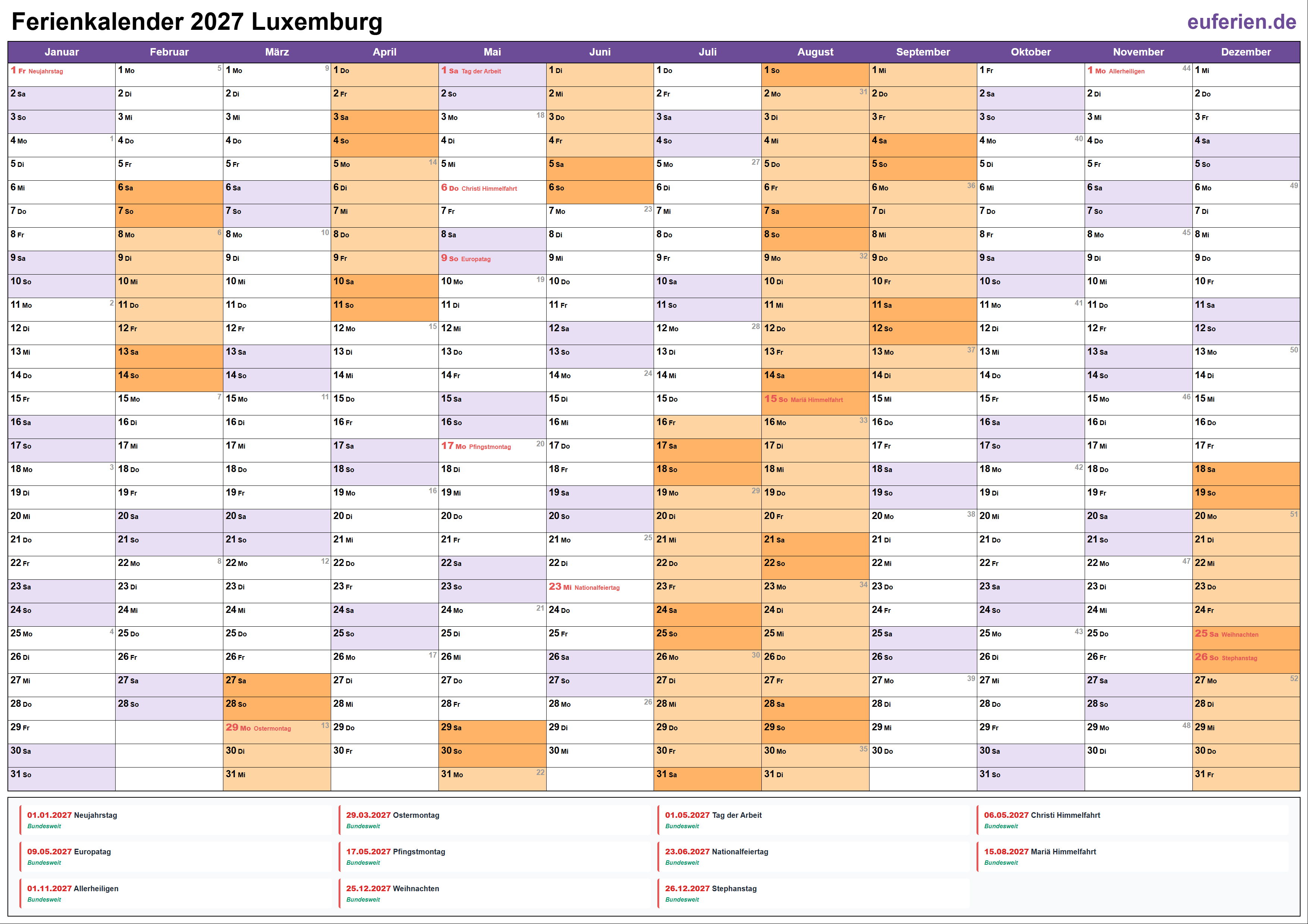 Ferienkalender Luxemburg 2027 herunterladen
