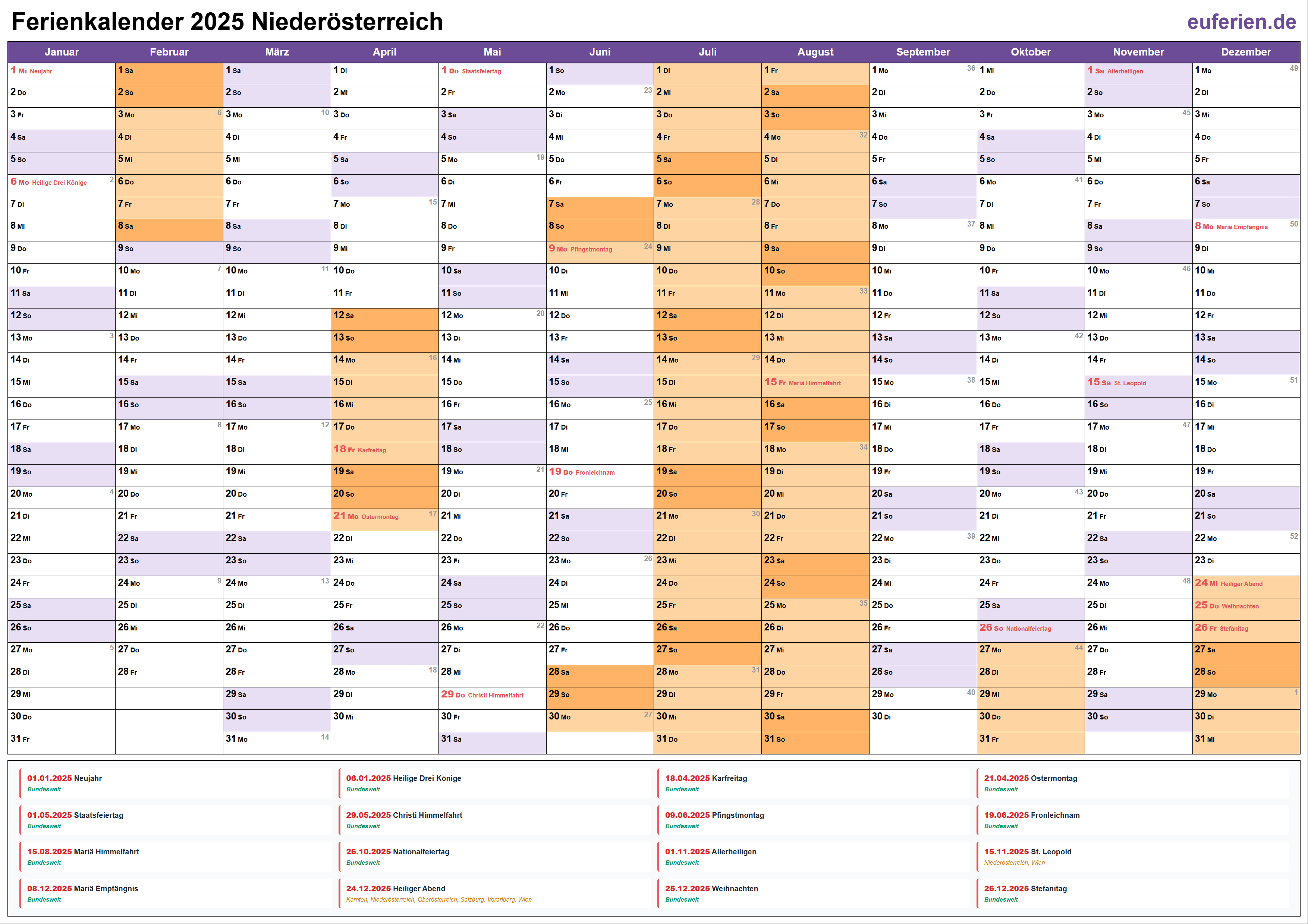 Ferienkalender Niederösterreich 2025 herunterladen
