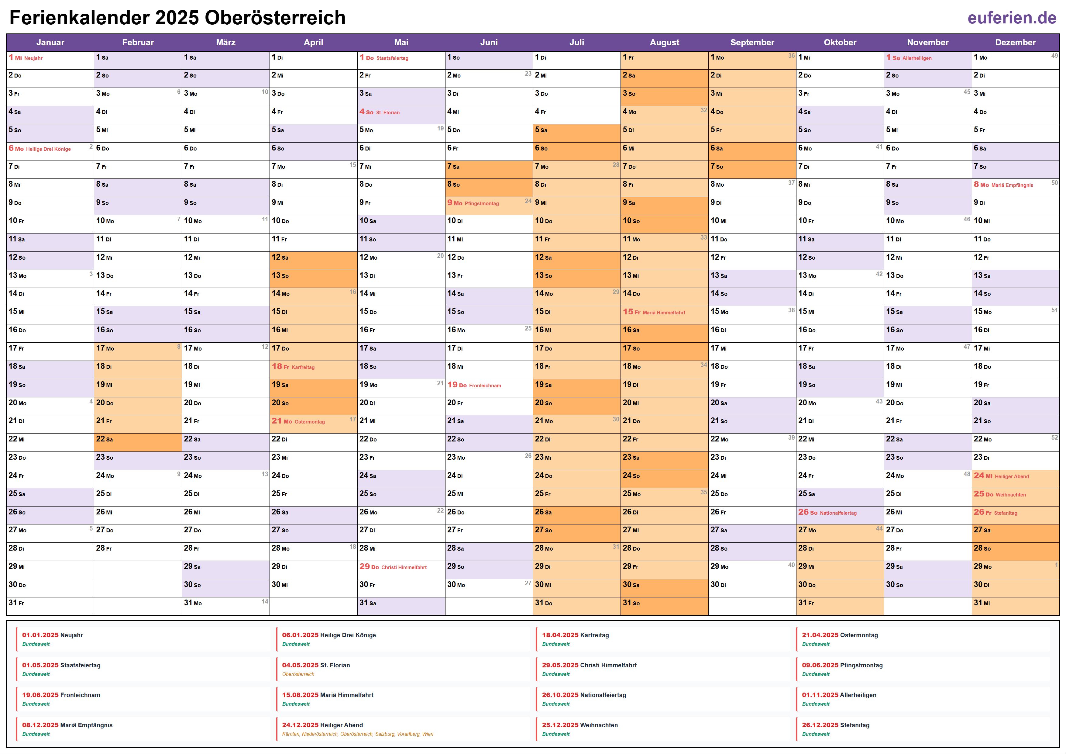 Ferienkalender Oberösterreich 2025 herunterladen