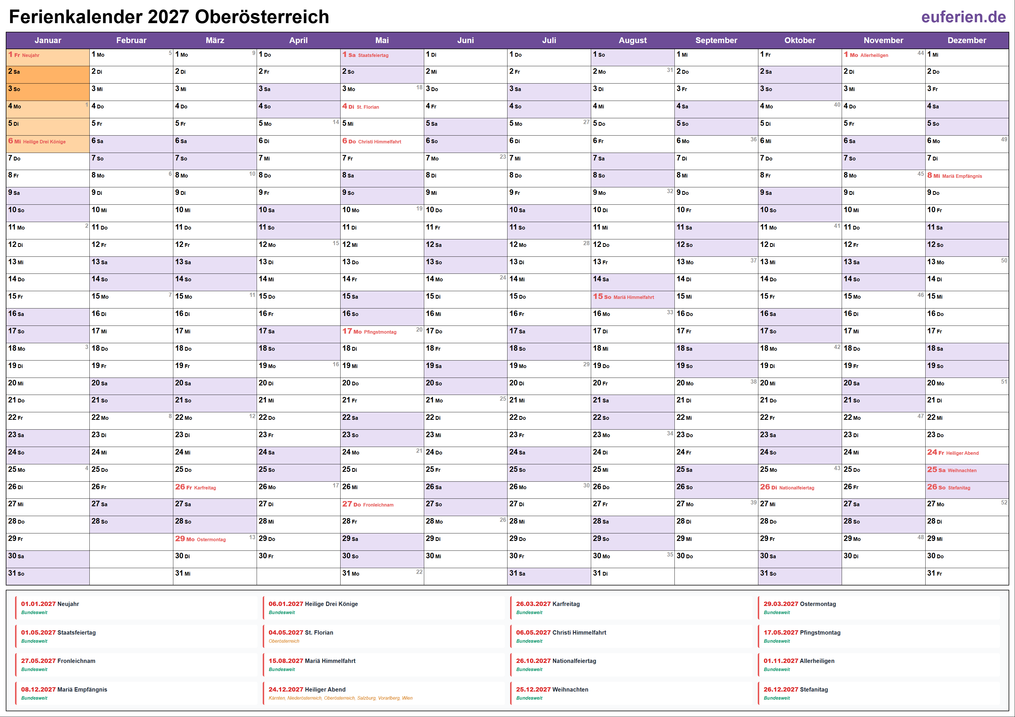Ferienkalender Oberösterreich 2027 herunterladen