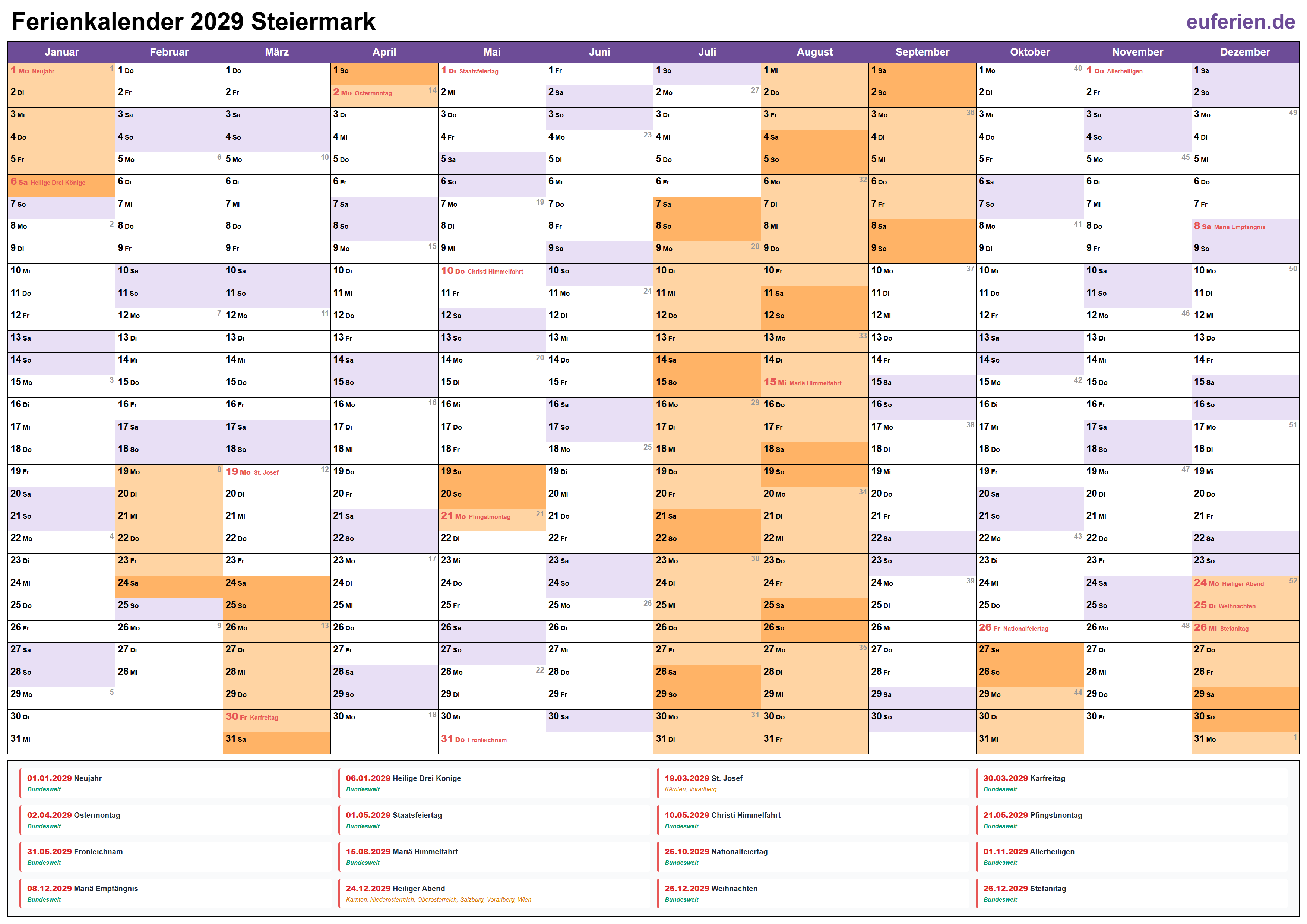 Schulferien Steiermark 2029 – Ferien & Feiertage