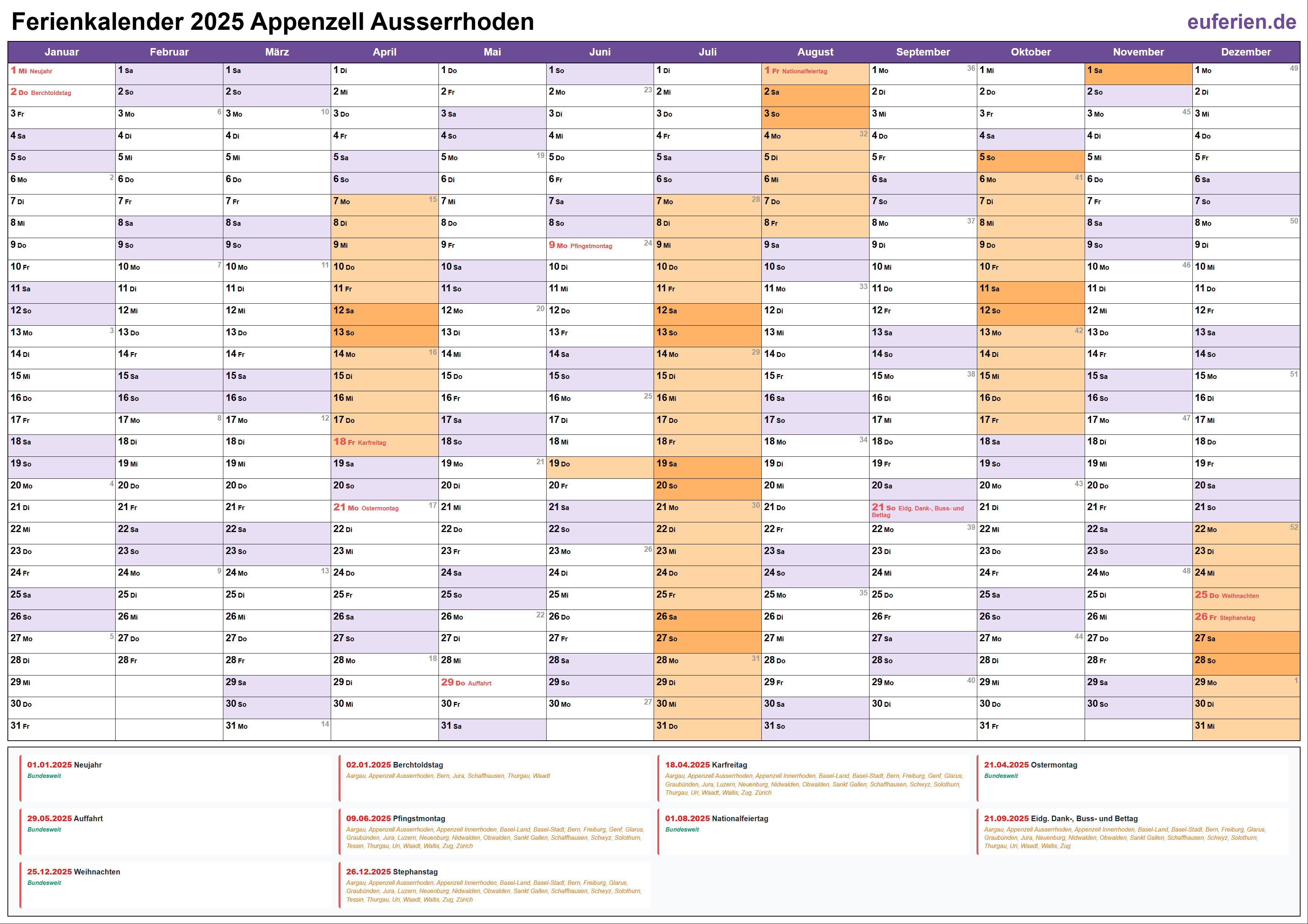 Ferienkalender Appenzell Ausserrhoden 2025 herunterladen