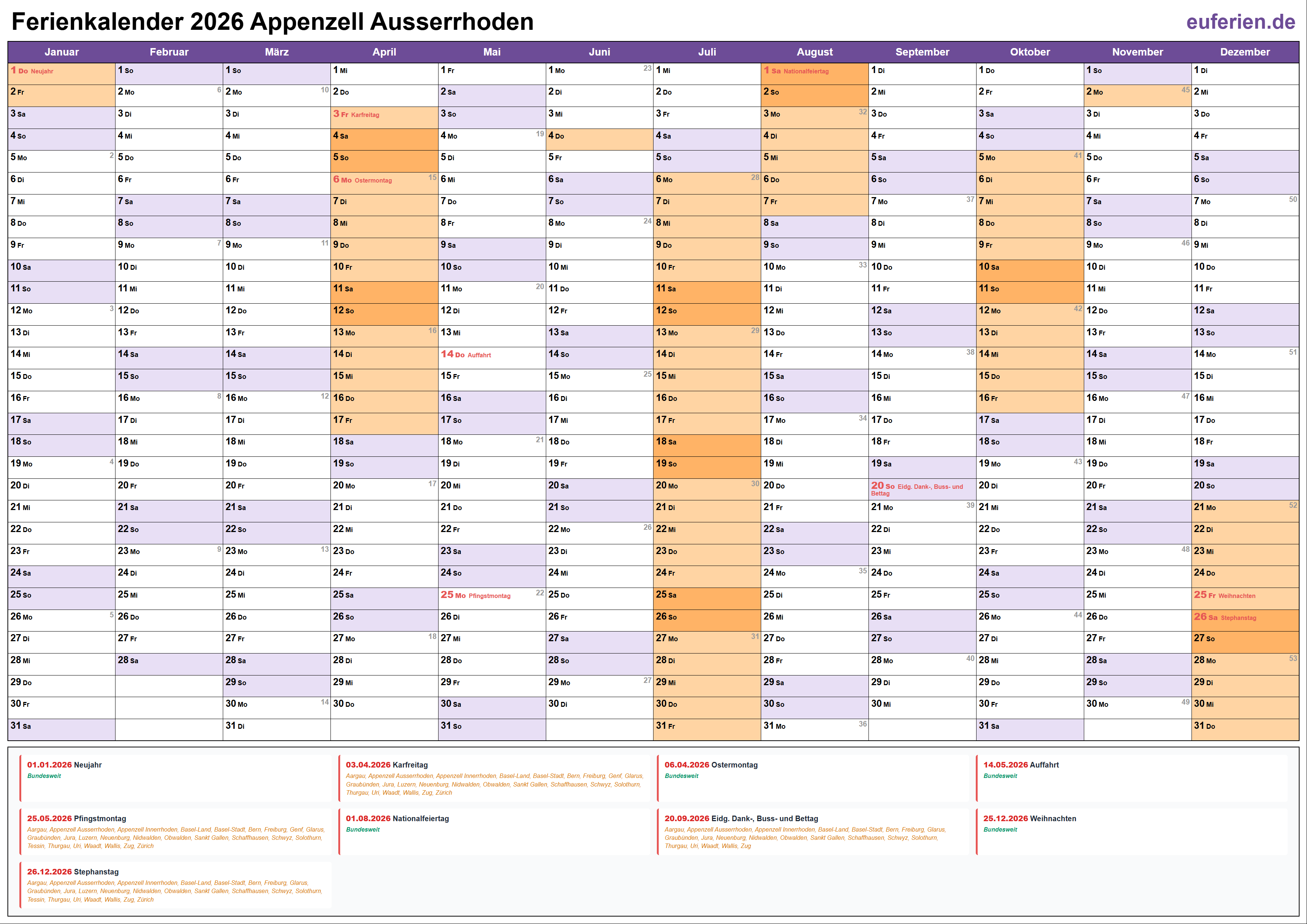 Ferienkalender Appenzell Ausserrhoden 2026 herunterladen