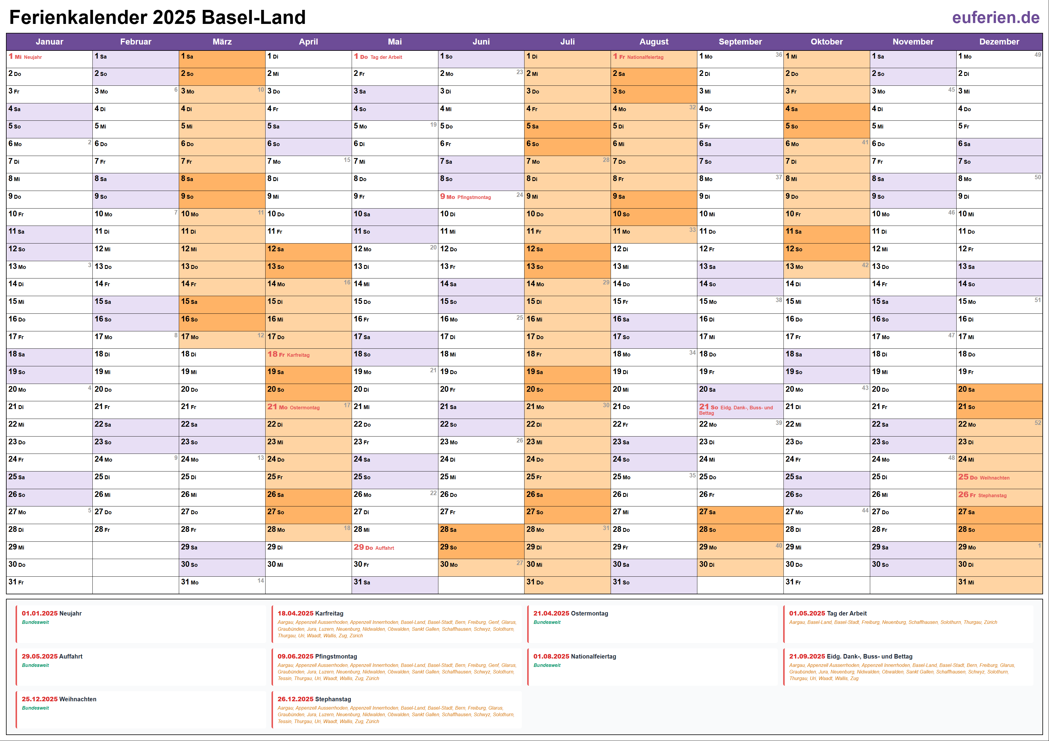Ferienkalender Basel-Land 2025 herunterladen