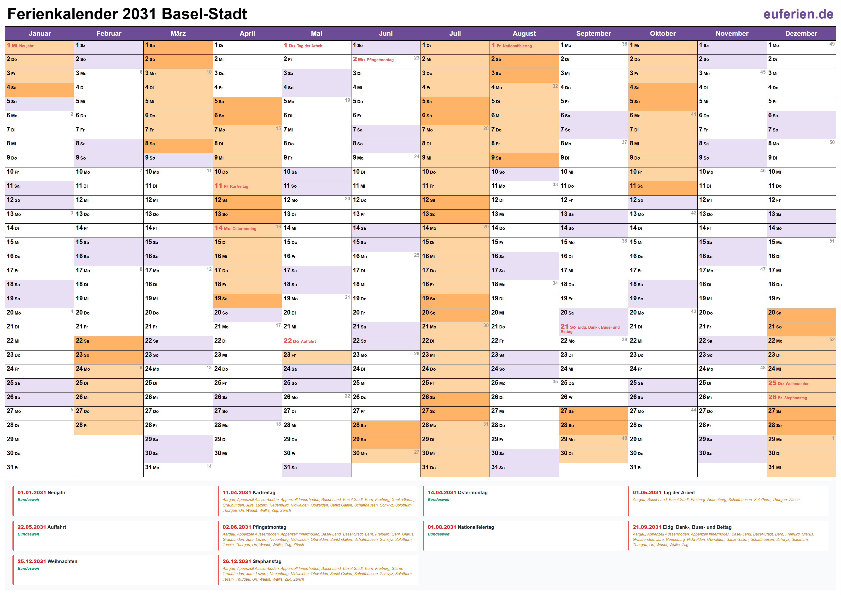 Ferienkalender Basel-Stadt 2031 herunterladen