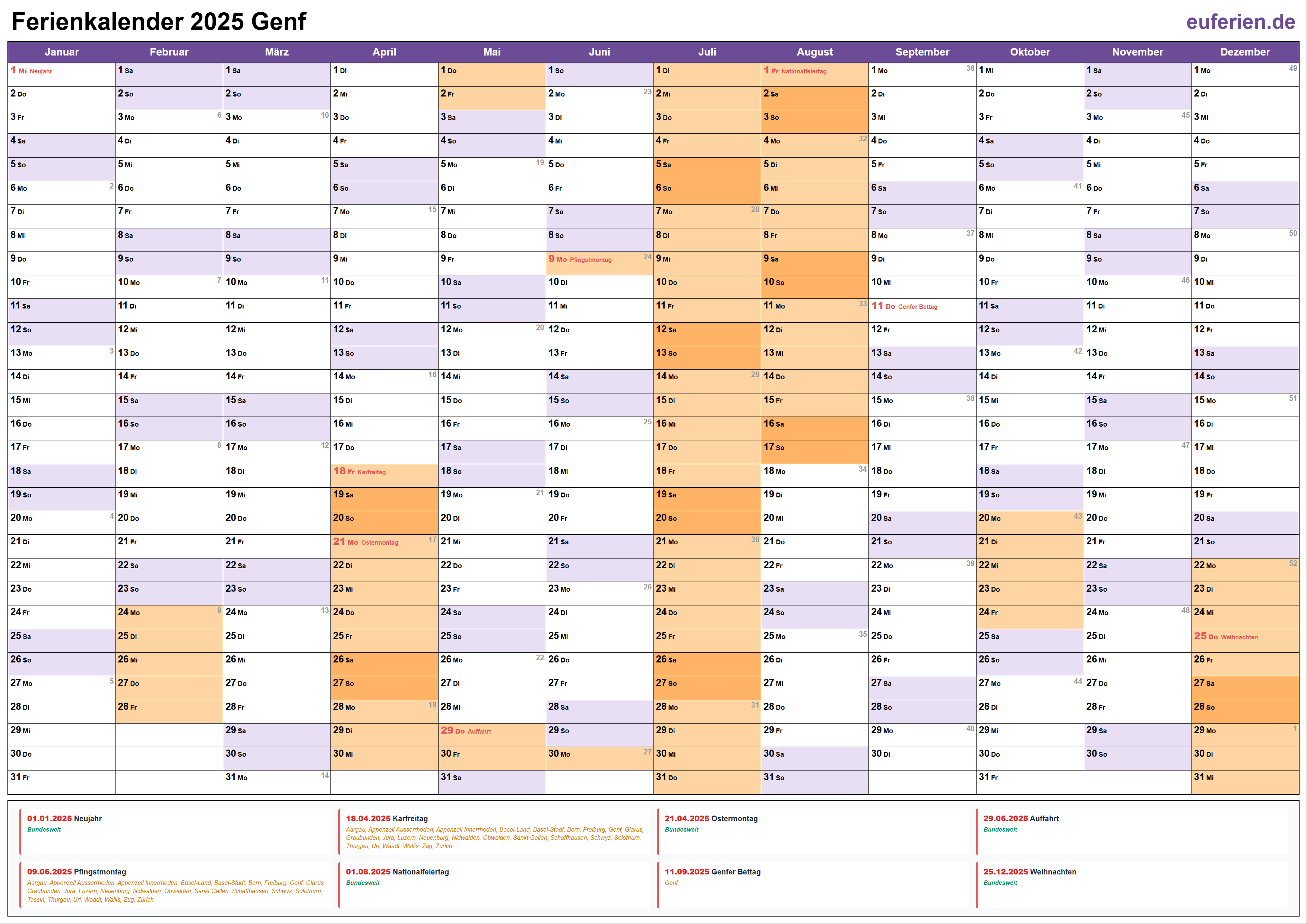 Ferienkalender Genf 2025 herunterladen