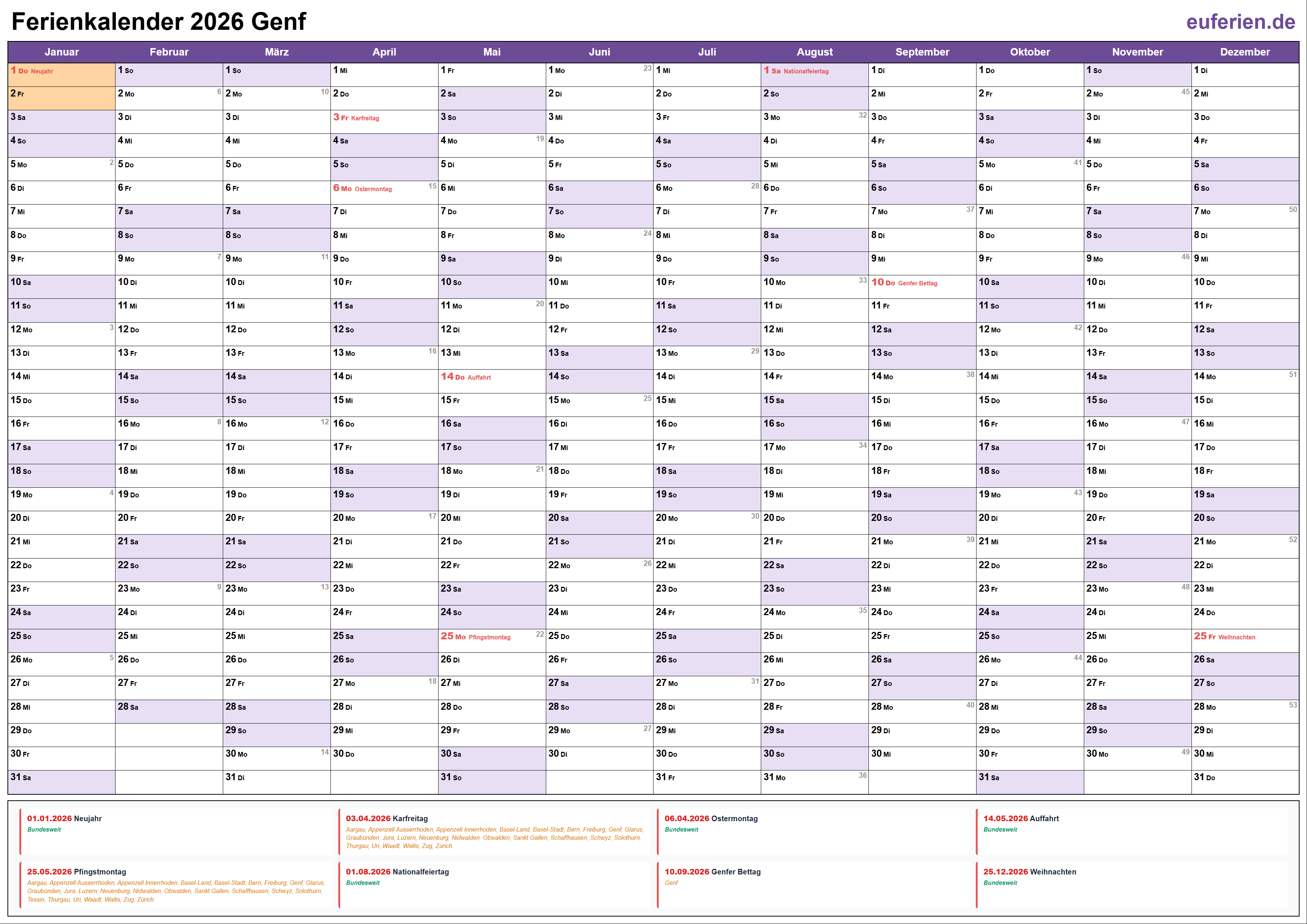 Schulferien, Feiertage und Ferien in Genf im Jahr 2026 im Überblick