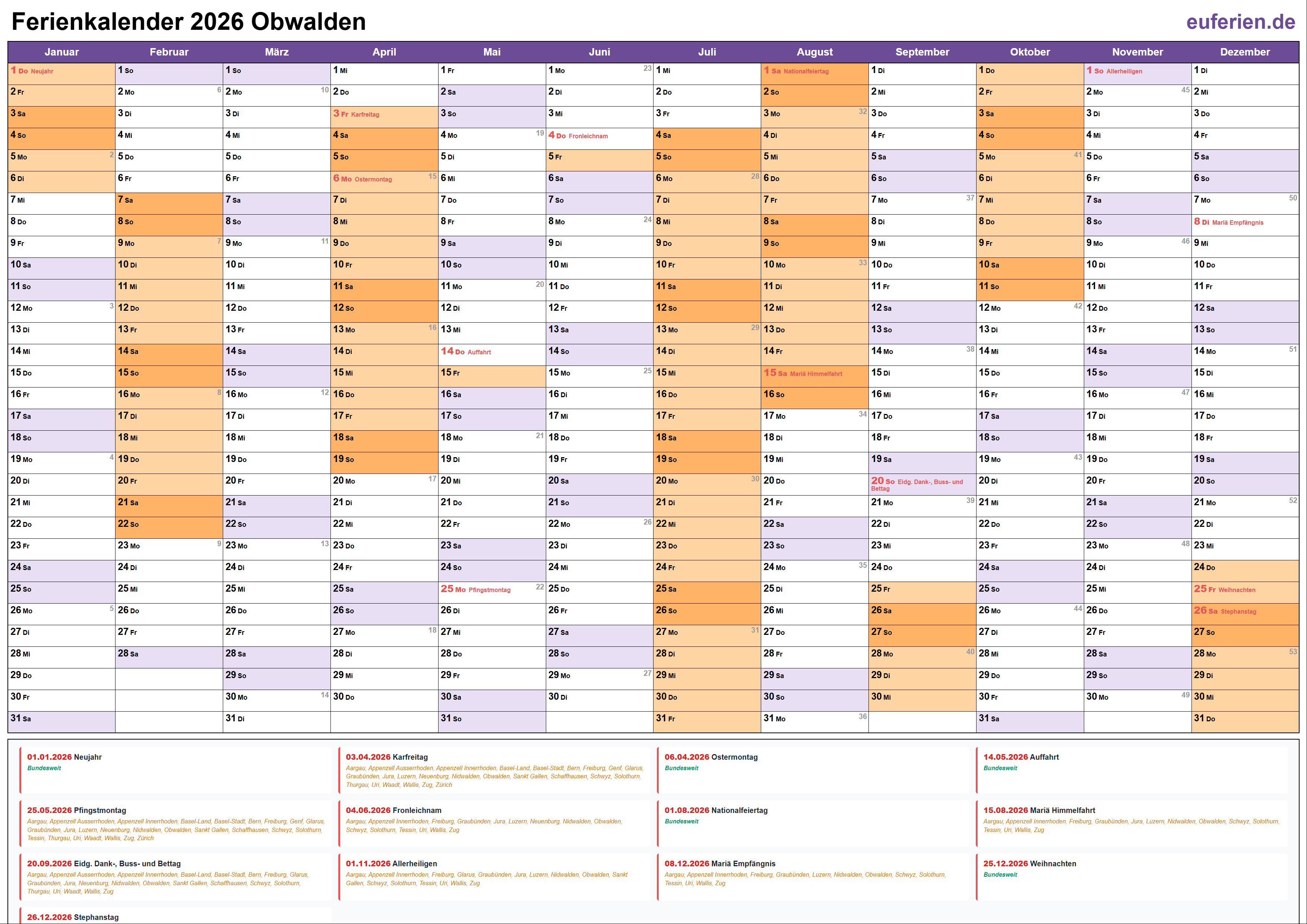 Auf dieser Seite finden Sie alle Schulferien in Obwalden sowie die gesetzlichen Feiertage 2026 übersichtlich dargestellt. Der Ferienkalender zeigt Ihnen alle wichtigen Ferientermine für Schulen, Familien und Berufstätige.