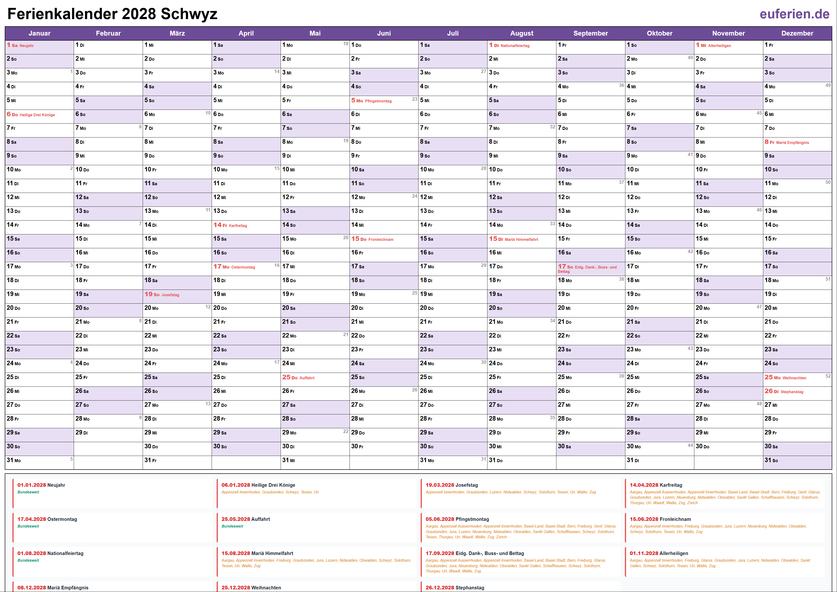 Schulferien Schwyz 2028 – Ferien & Feiertage