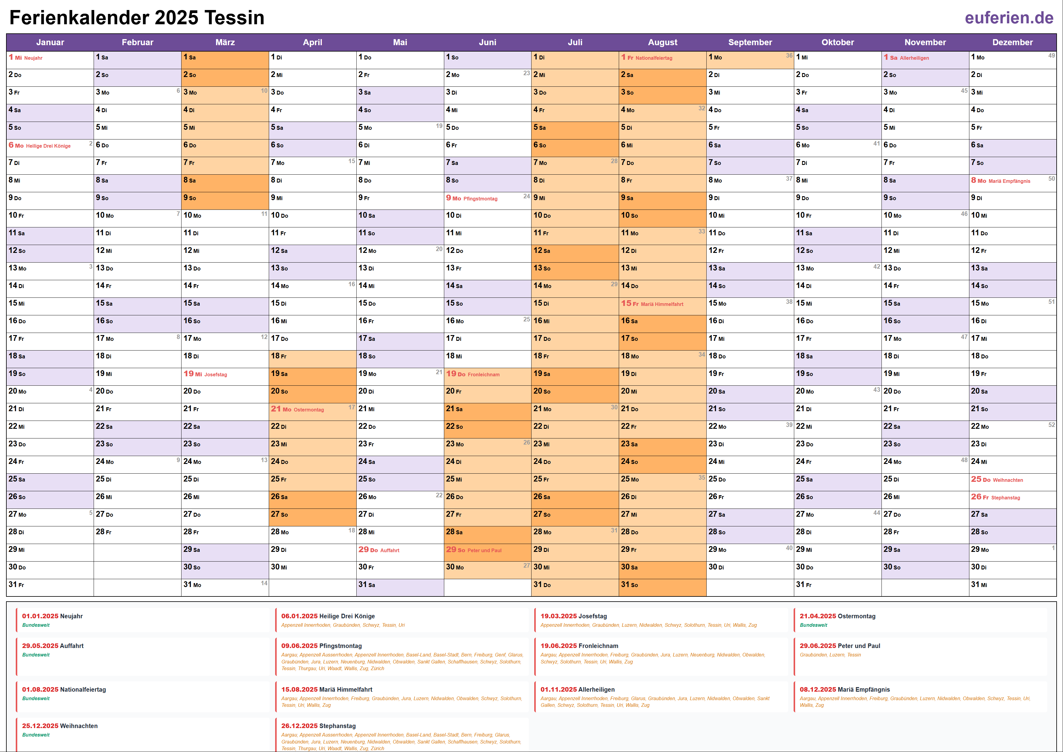 Auf dieser Seite finden Sie alle Schulferien in Tessin sowie die gesetzlichen Feiertage 2025 übersichtlich dargestellt. Der Ferienkalender zeigt Ihnen alle wichtigen Ferientermine für Schulen, Familien und Berufstätige.