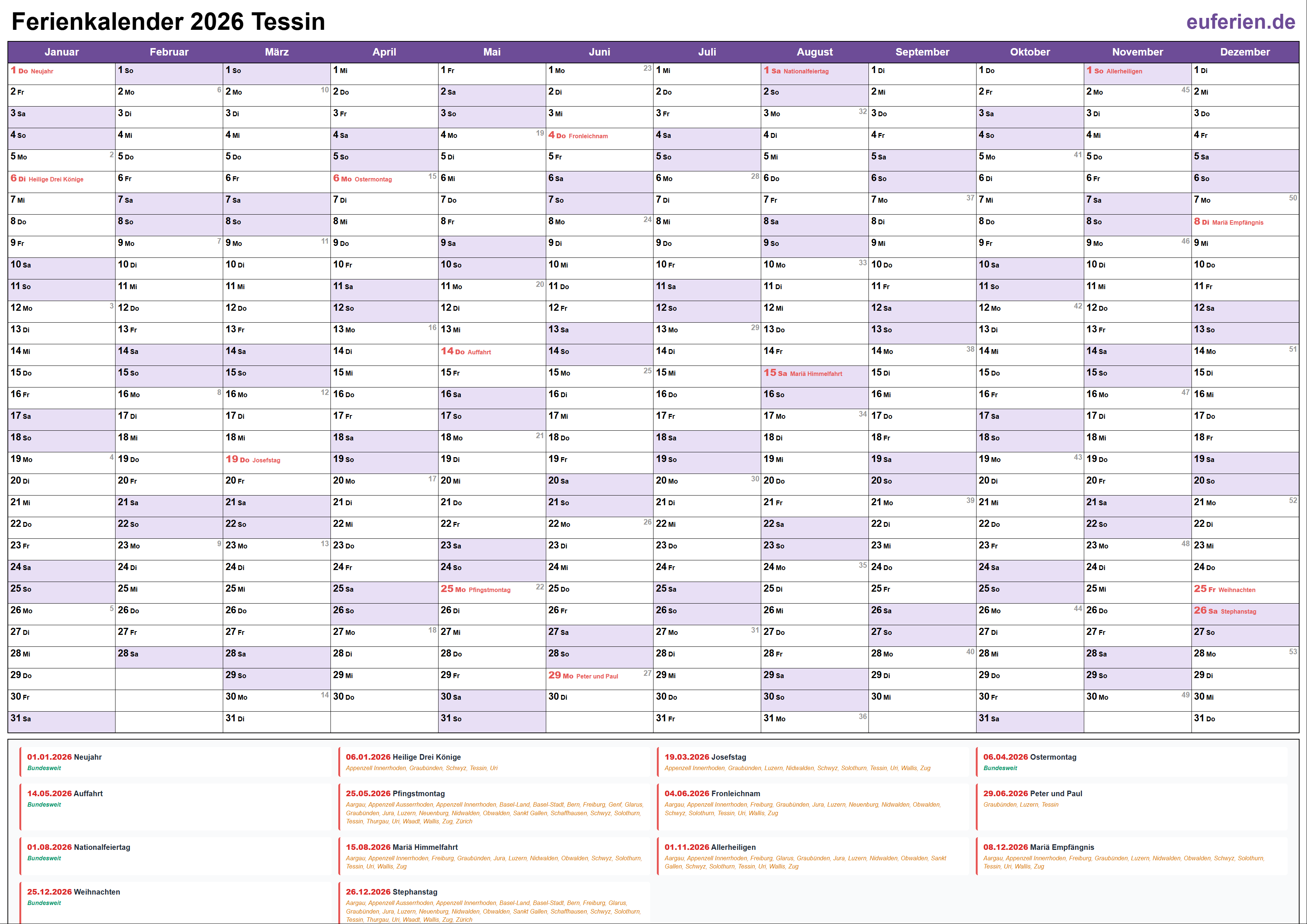 Ferienkalender Tessin 2026 herunterladen