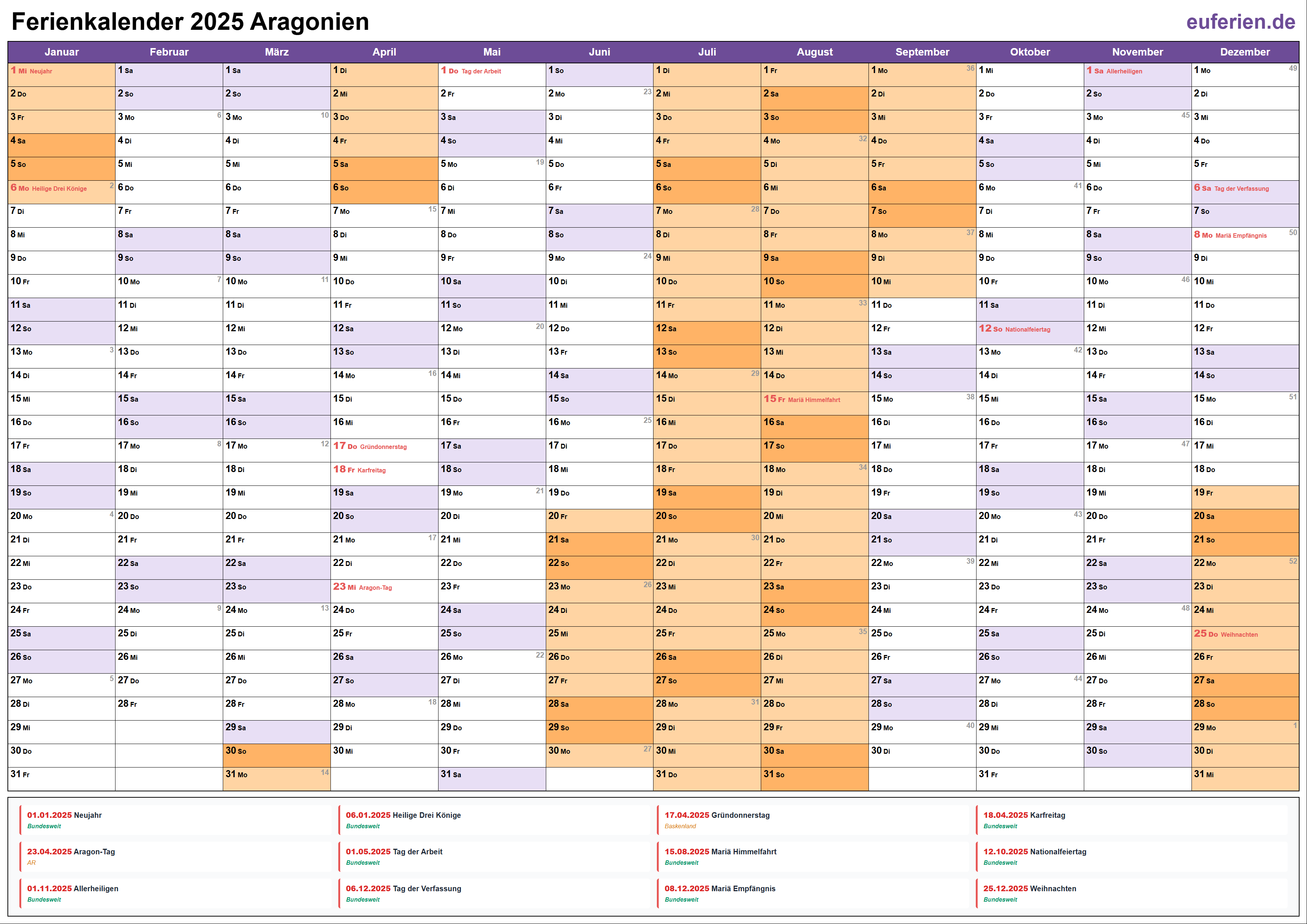 Ferienkalender Aragonien 2025 herunterladen
