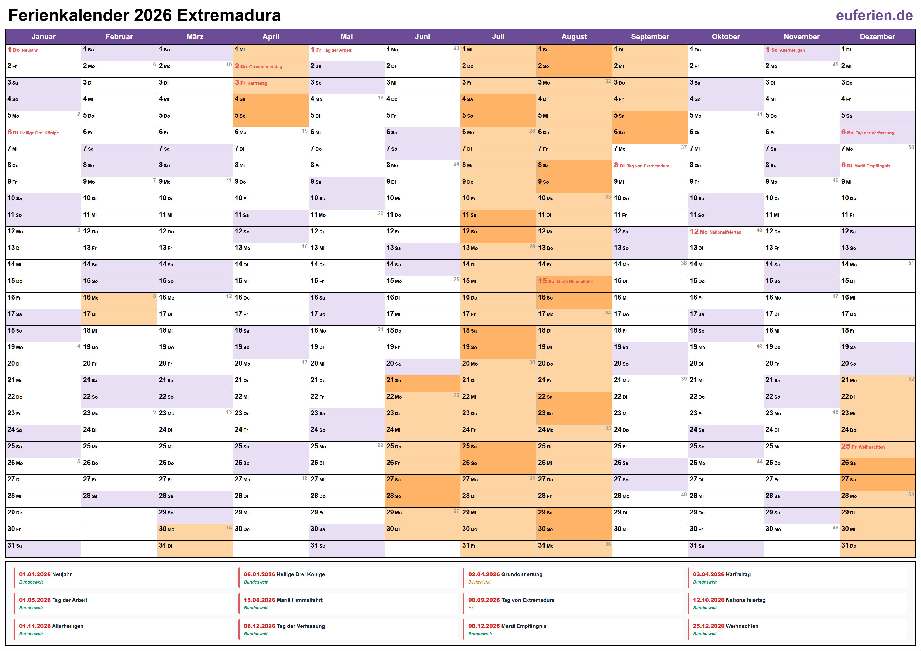 Ferienkalender Extremadura 2026 herunterladen