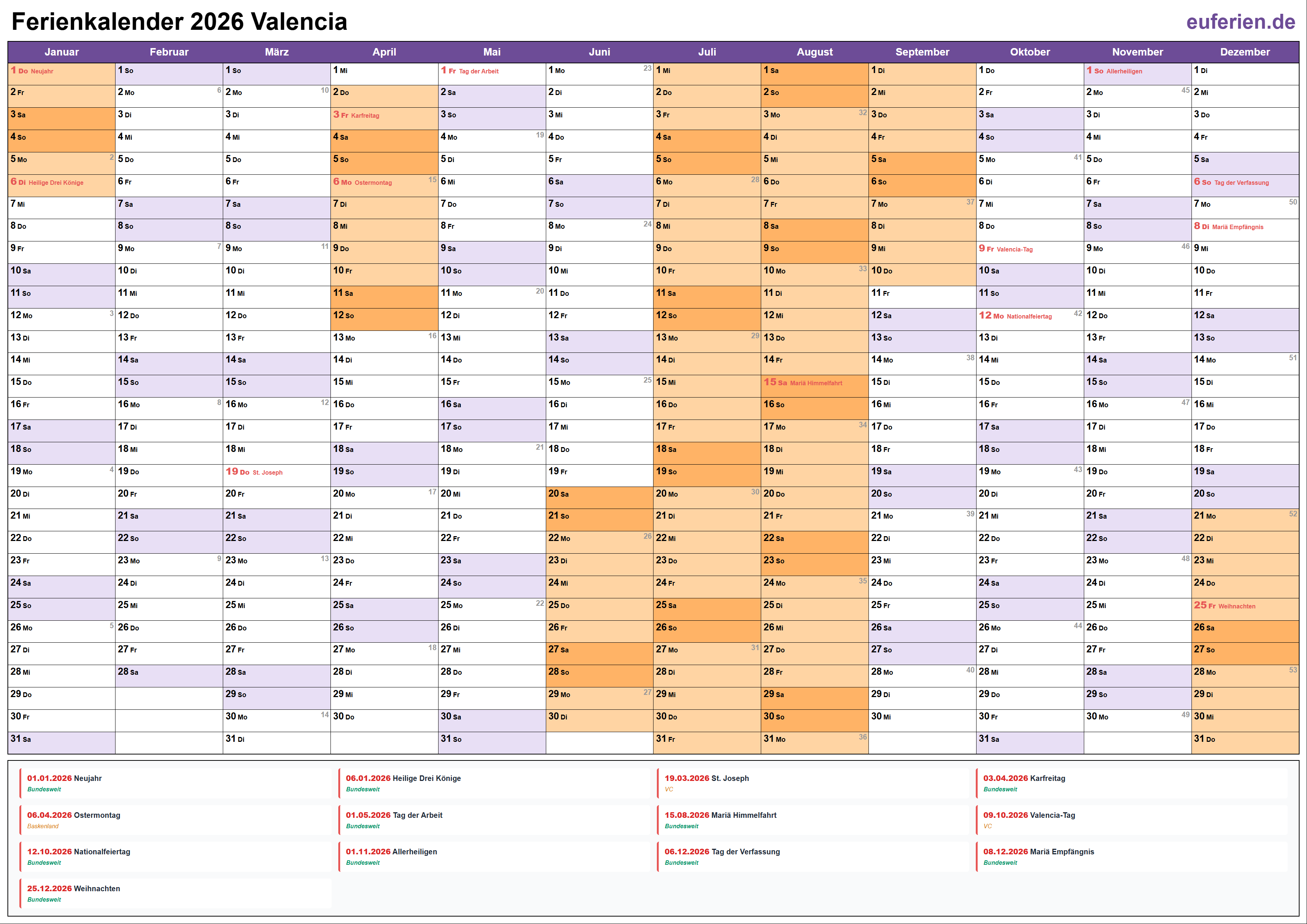 Ferienkalender Valencia 2026 herunterladen