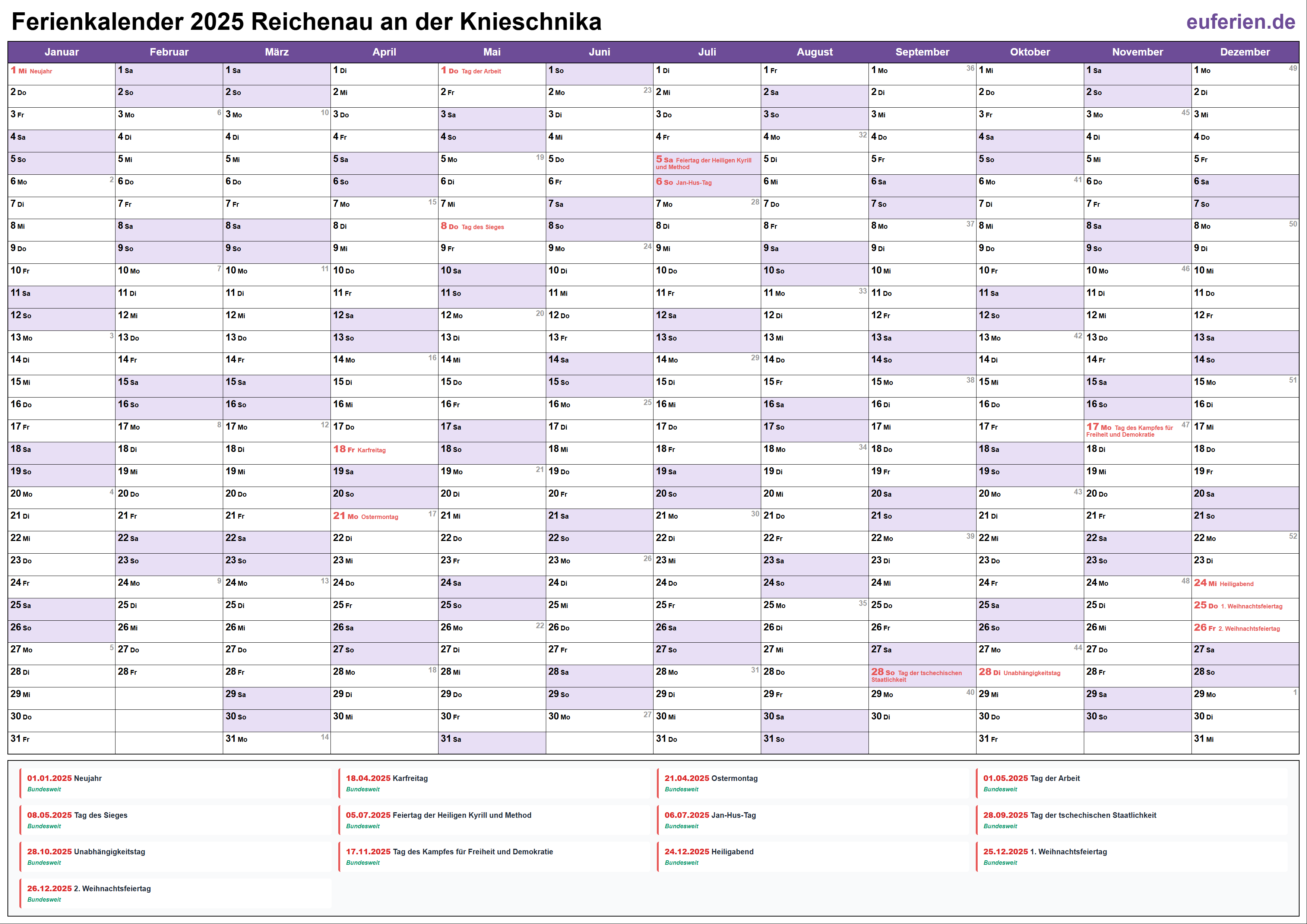 Schulferien und Feiertage in Reichenau an der Knieschnika 2025