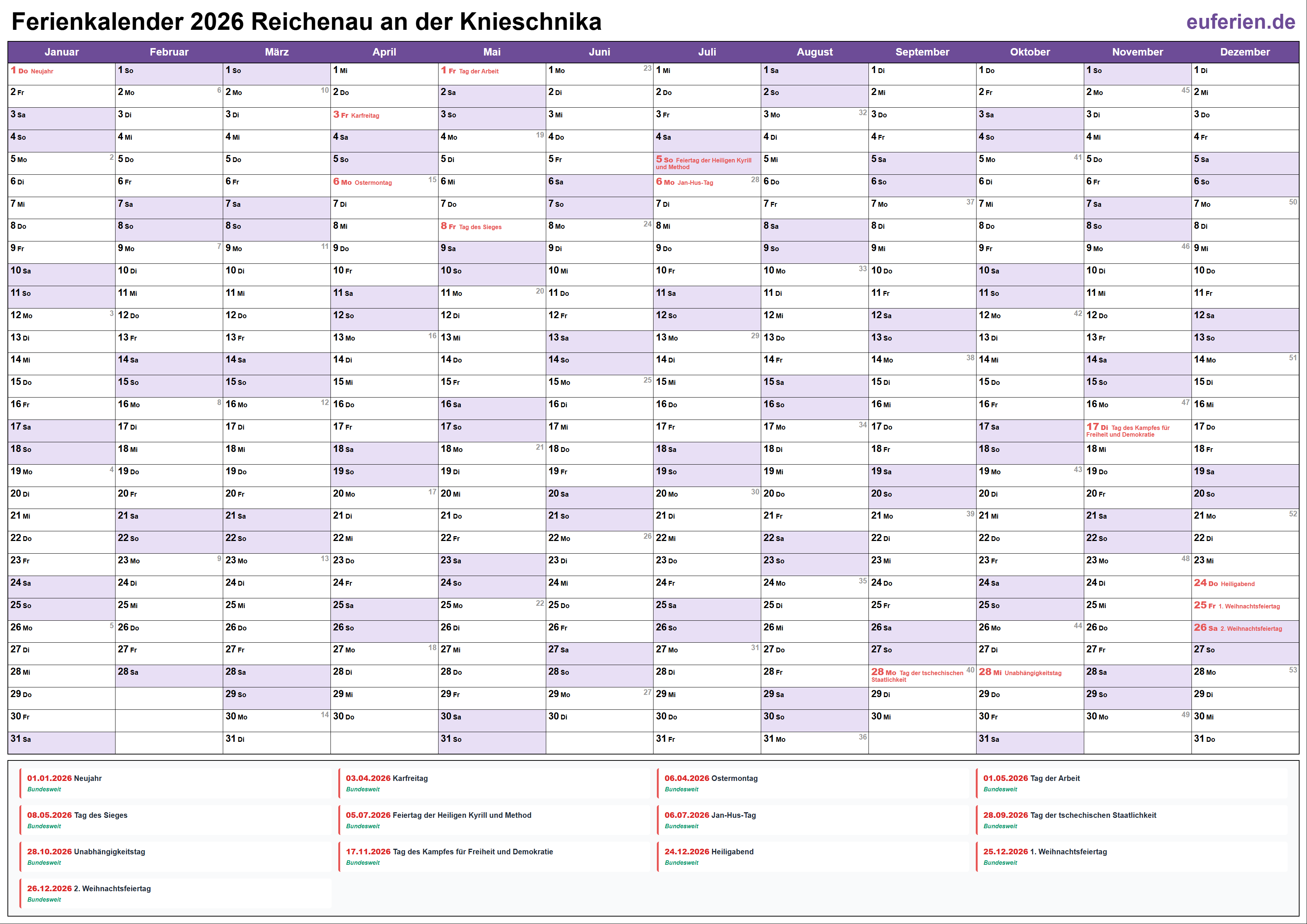 Schulferien und Feiertage in Reichenau an der Knieschnika 2026