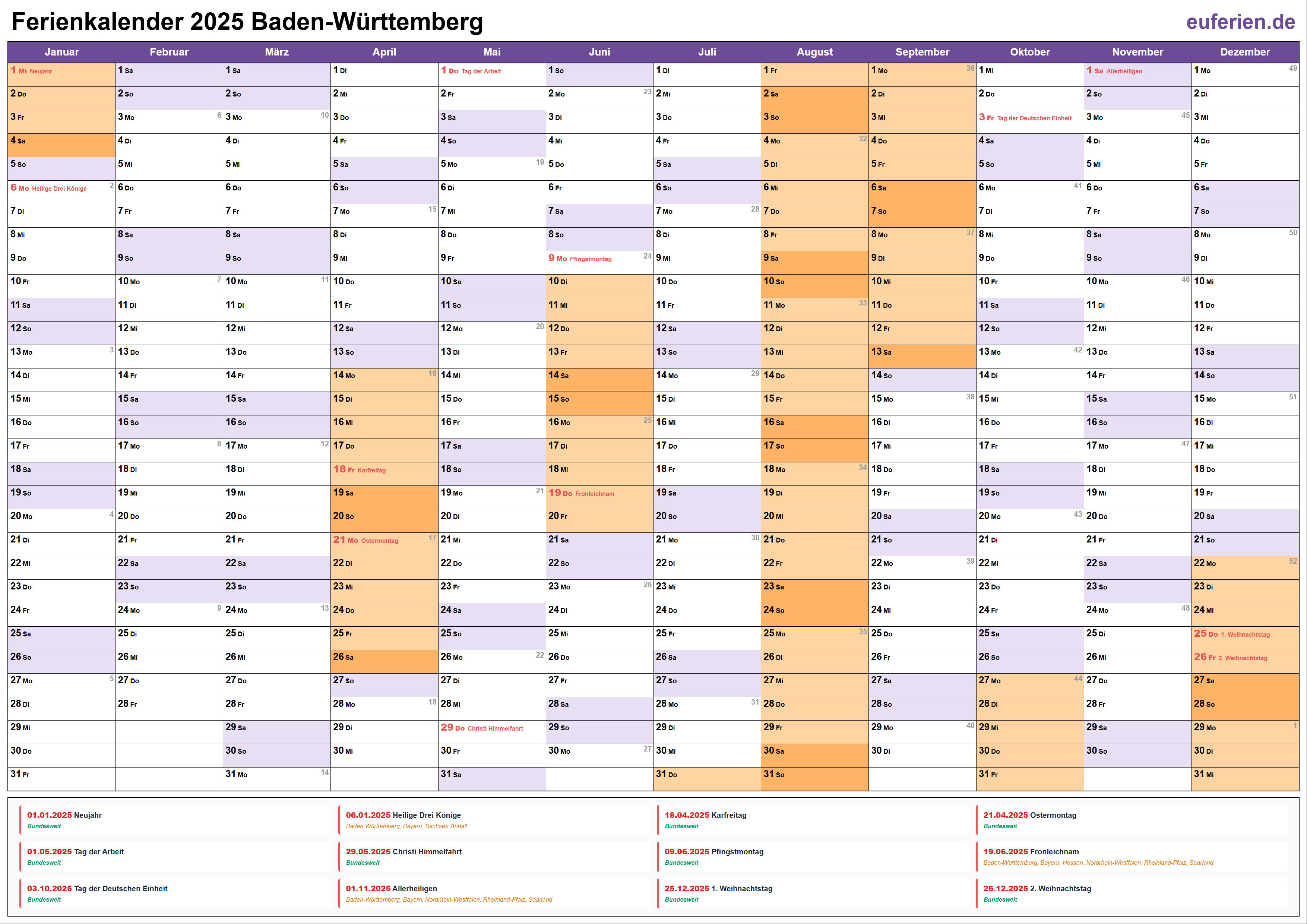 Ferienkalender Baden-Württemberg 2025 herunterladen