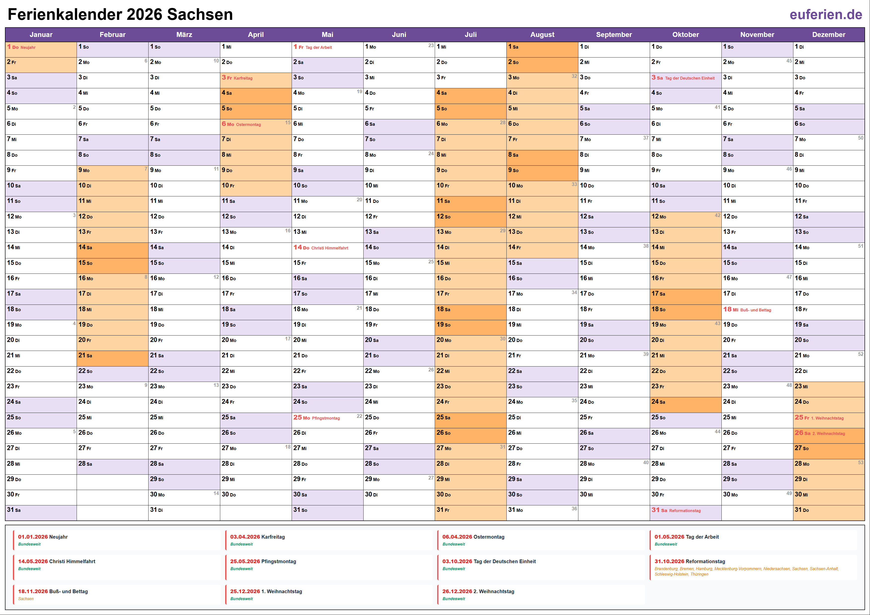 Auf dieser Seite finden Sie alle Schulferien in Sachsen sowie die gesetzlichen Feiertage 2026 übersichtlich dargestellt. Der Ferienkalender zeigt Ihnen alle wichtigen Ferientermine für Schulen, Familien und Berufstätige.