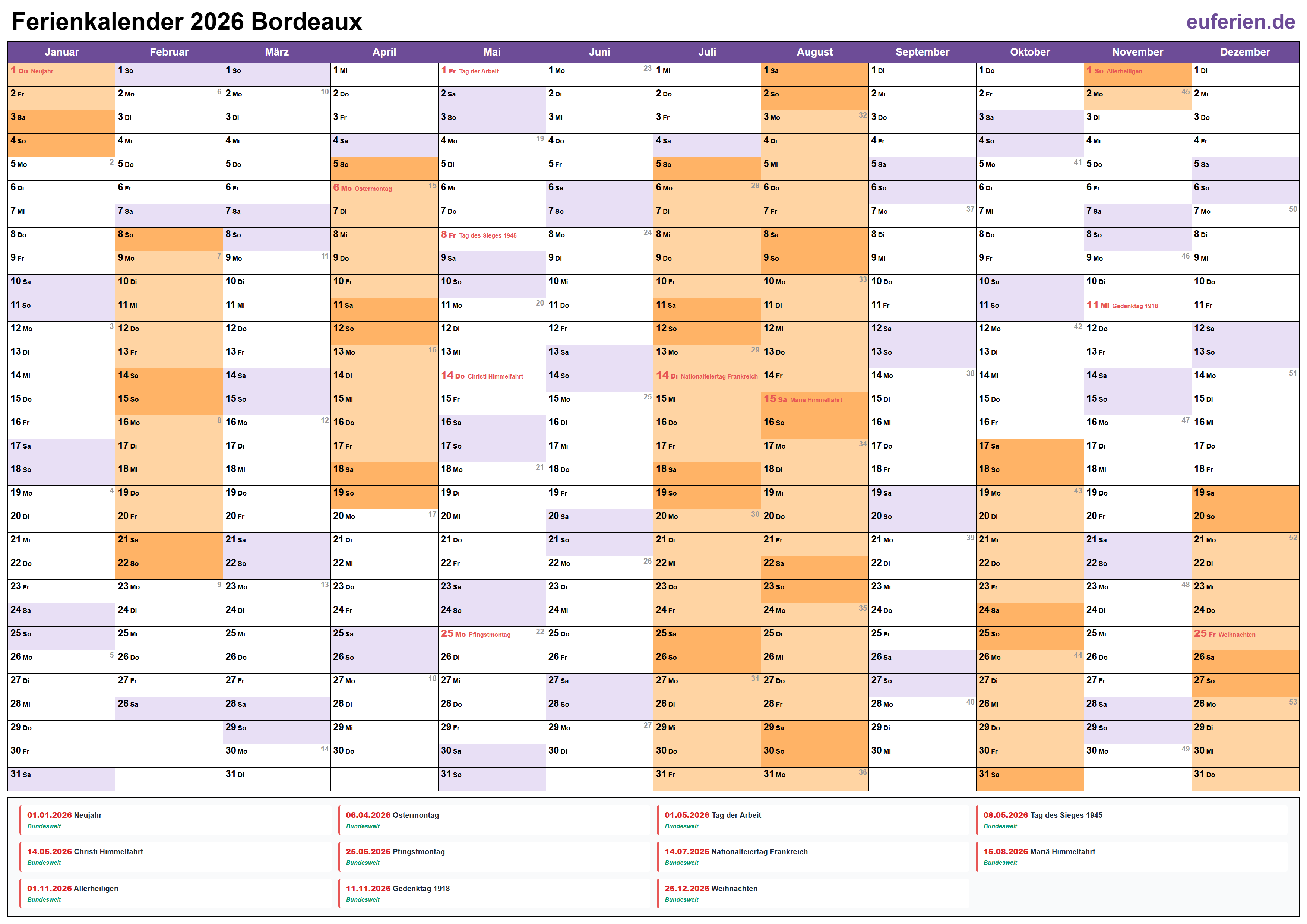 Auf dieser Seite finden Sie alle Schulferien in Bordeaux sowie die gesetzlichen Feiertage 2026 übersichtlich dargestellt. Der Ferienkalender zeigt Ihnen alle wichtigen Ferientermine für Schulen, Familien und Berufstätige.