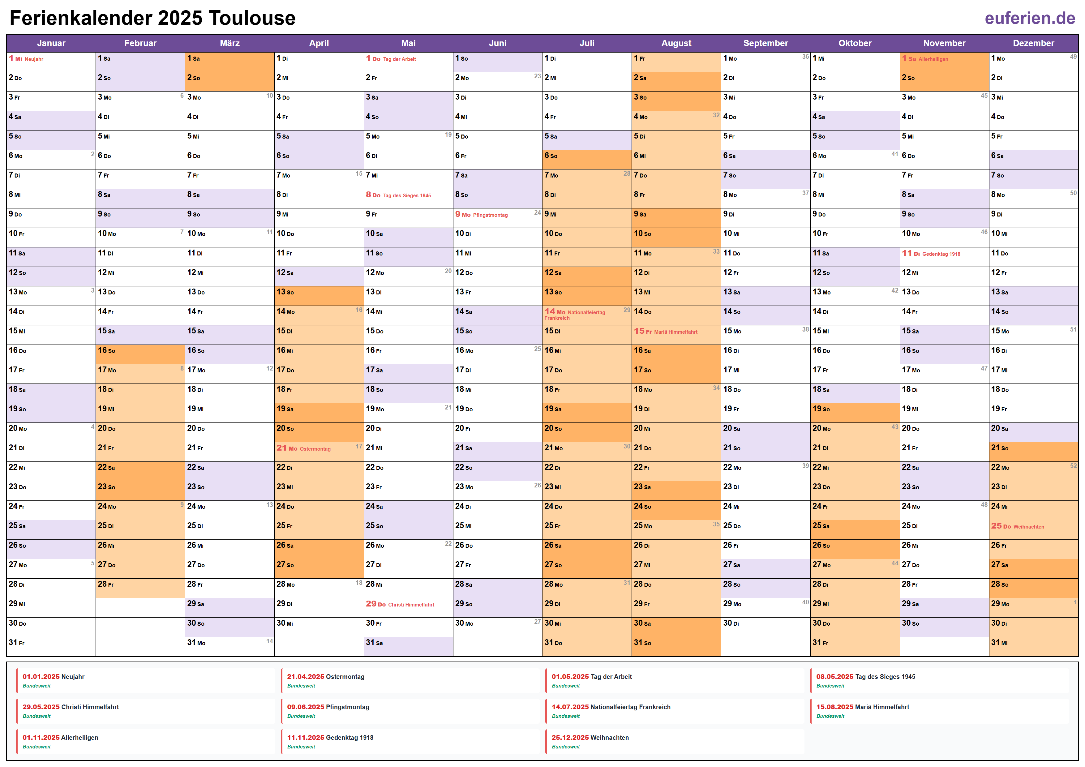 Ferienkalender Toulouse 2025 herunterladen