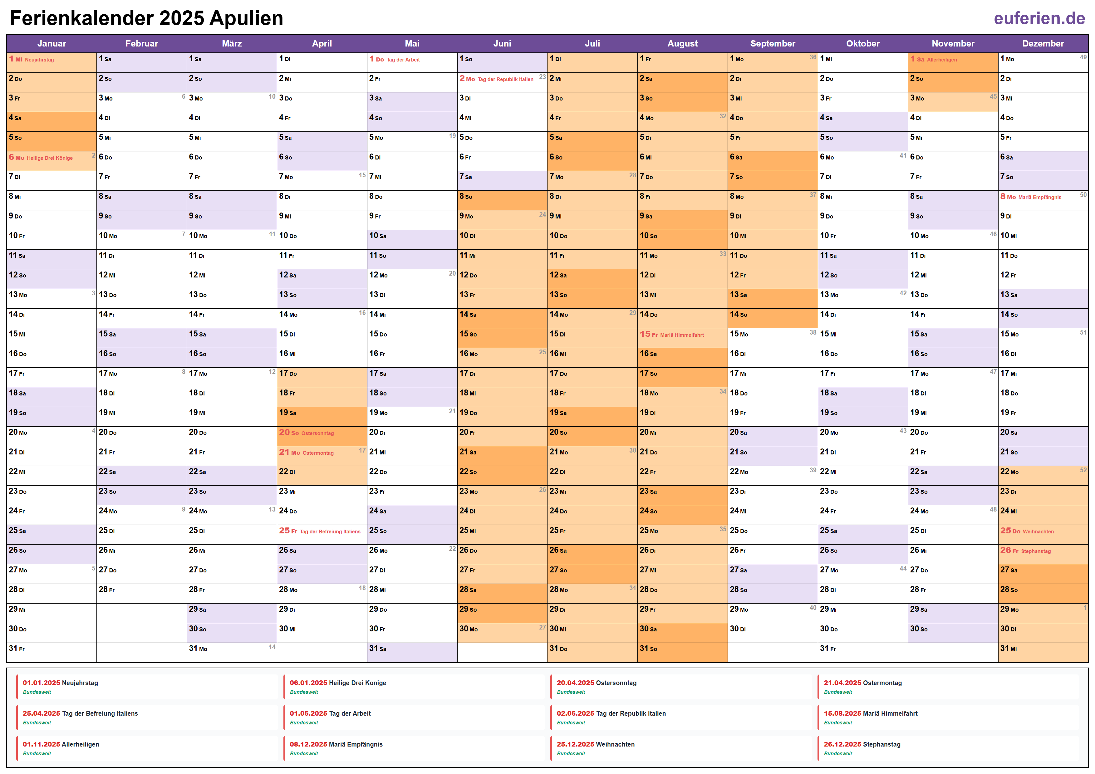 Auf dieser Seite finden Sie alle Schulferien in Apulien sowie die gesetzlichen Feiertage 2025 übersichtlich dargestellt. Der Ferienkalender zeigt Ihnen alle wichtigen Ferientermine für Schulen, Familien und Berufstätige.
