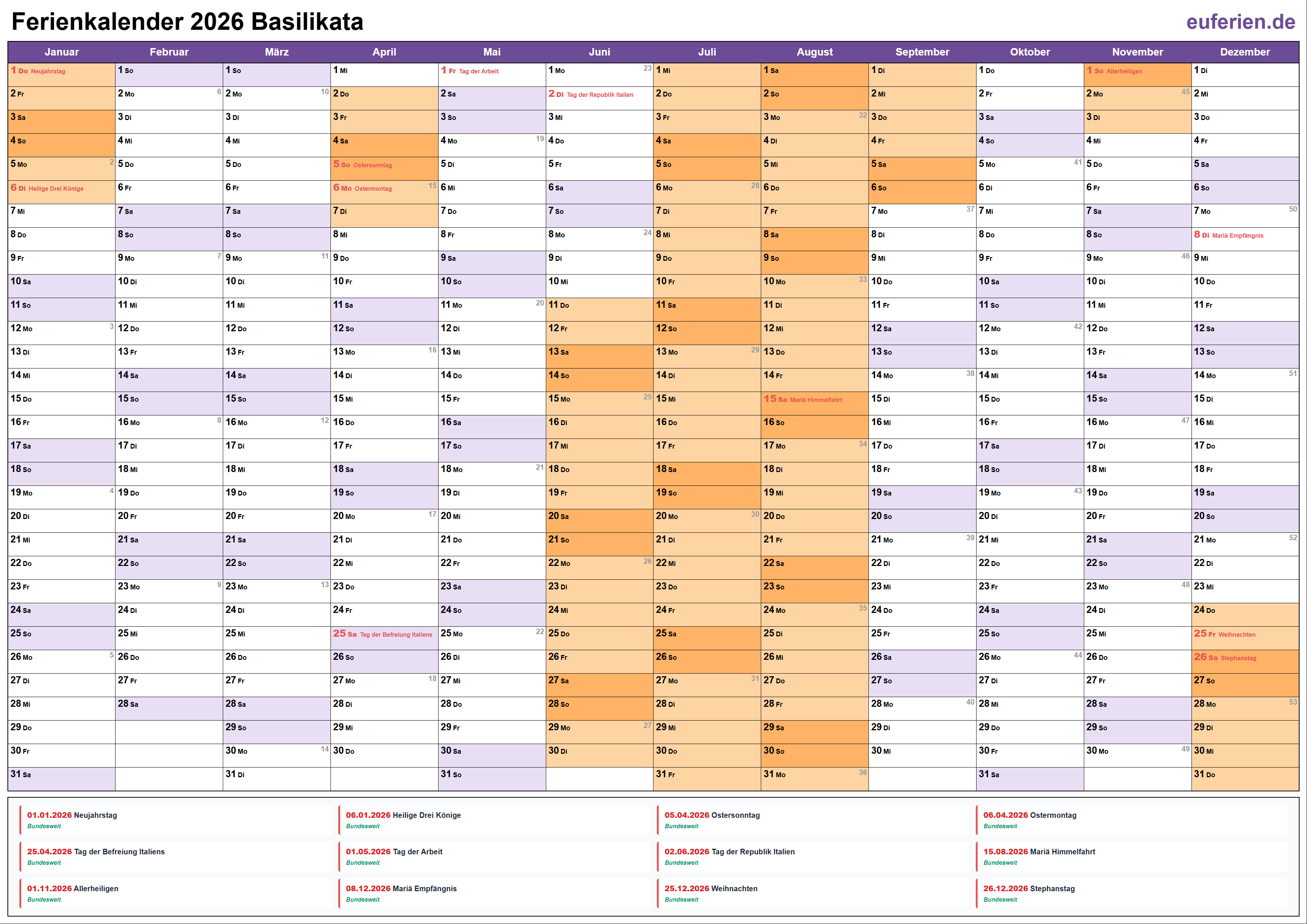 Auf dieser Seite finden Sie alle Schulferien in Basilikata sowie die gesetzlichen Feiertage 2026 übersichtlich dargestellt. Der Ferienkalender zeigt Ihnen alle wichtigen Ferientermine für Schulen, Familien und Berufstätige.