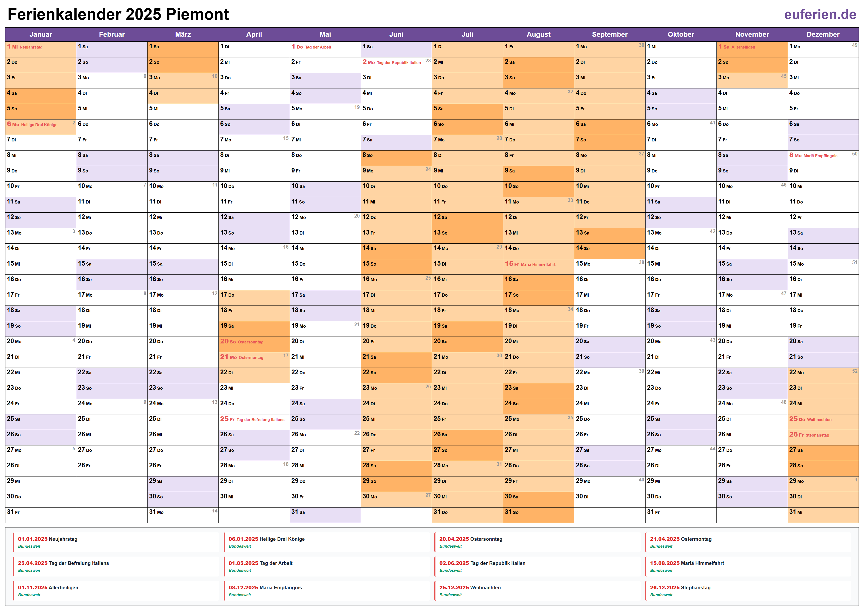 Ferienkalender Piemont 2025 herunterladen