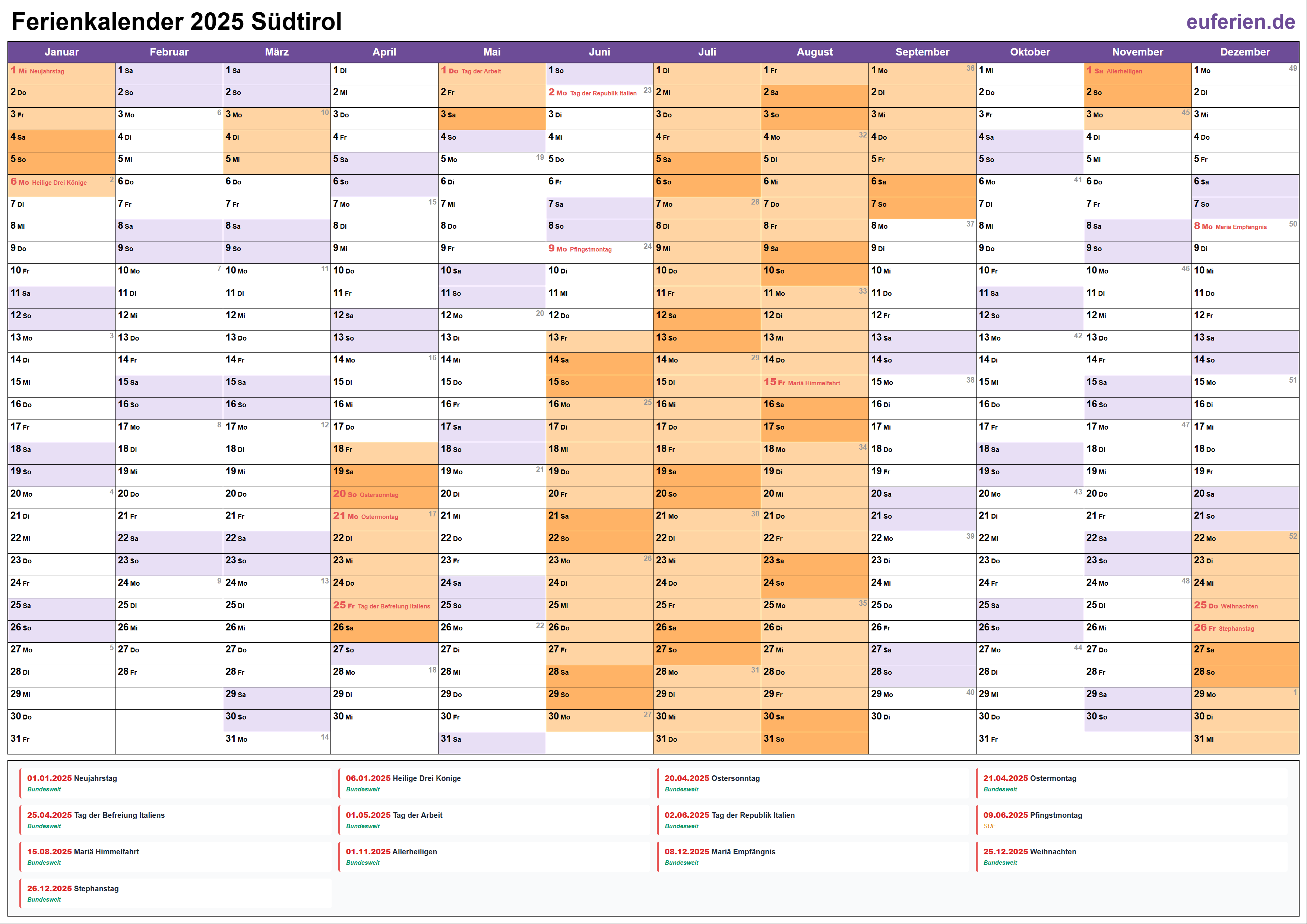 Ferienkalender Südtirol 2025 herunterladen