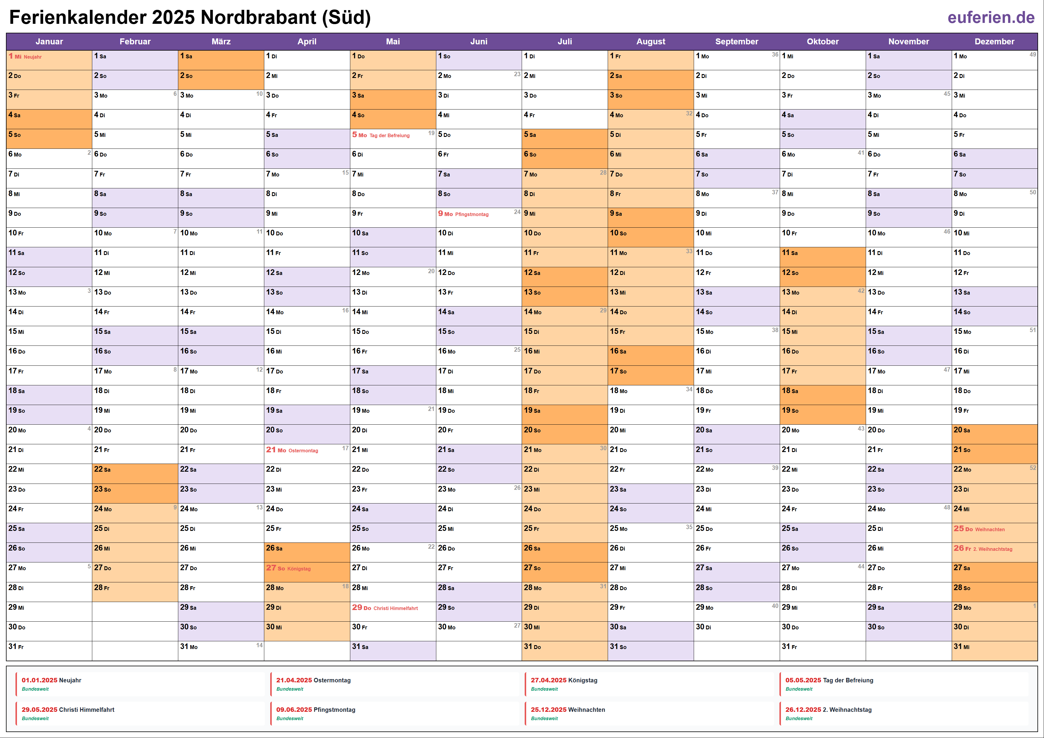 Ferienkalender Nordbrabant (Süd) 2025 herunterladen
