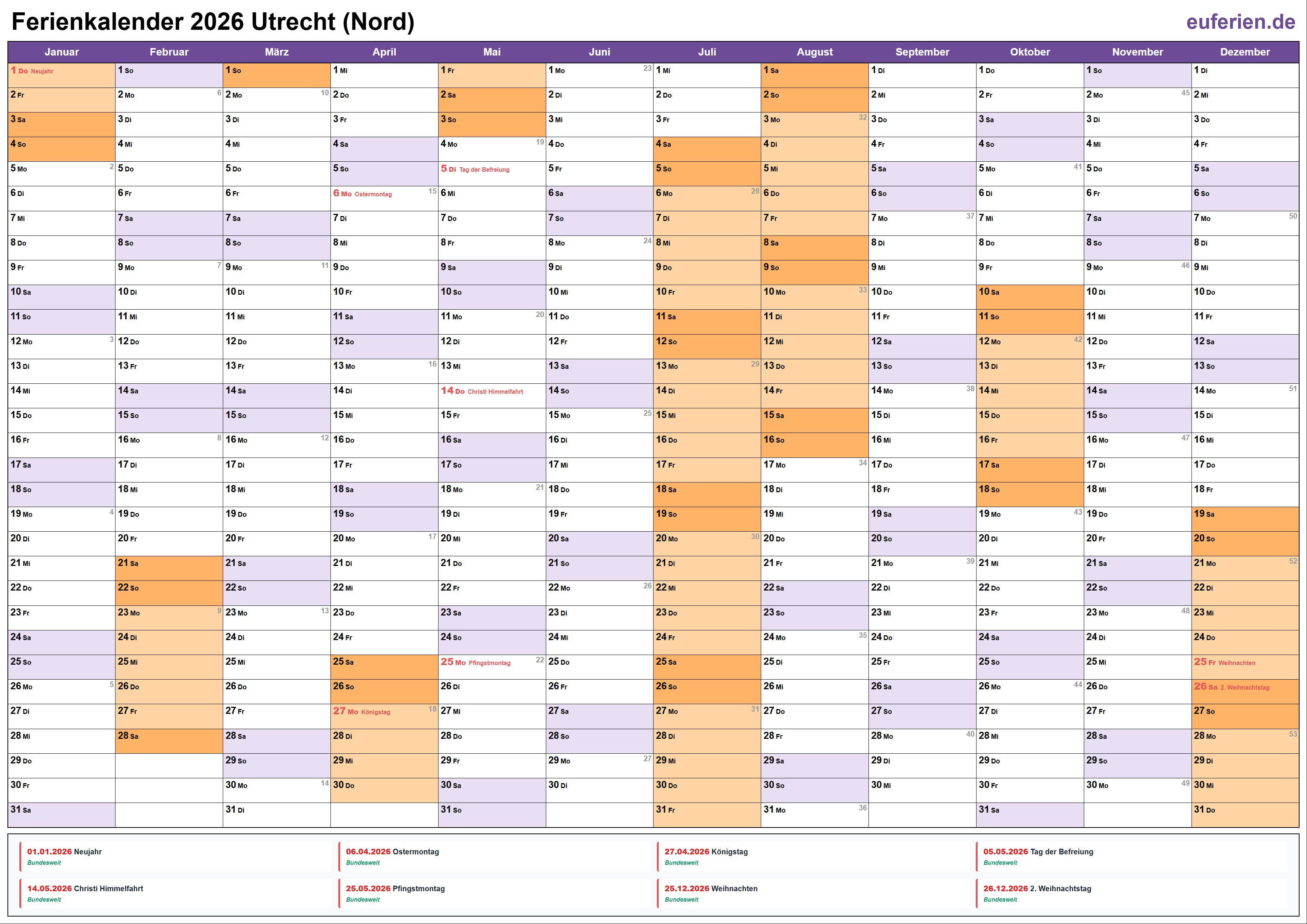 Ferienkalender Utrecht (Nord) 2026 herunterladen