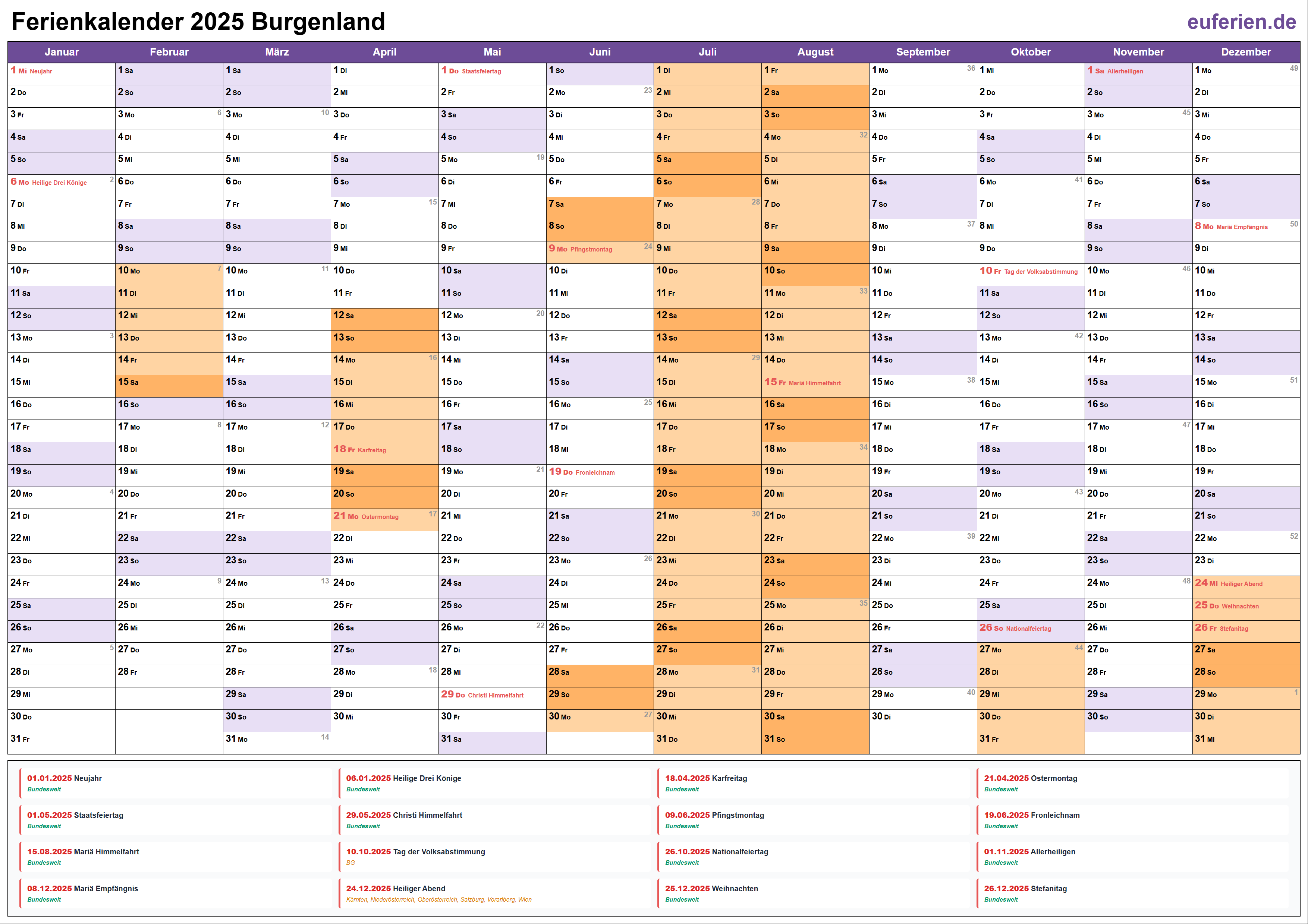Ferienkalender Burgenland 2025 herunterladen