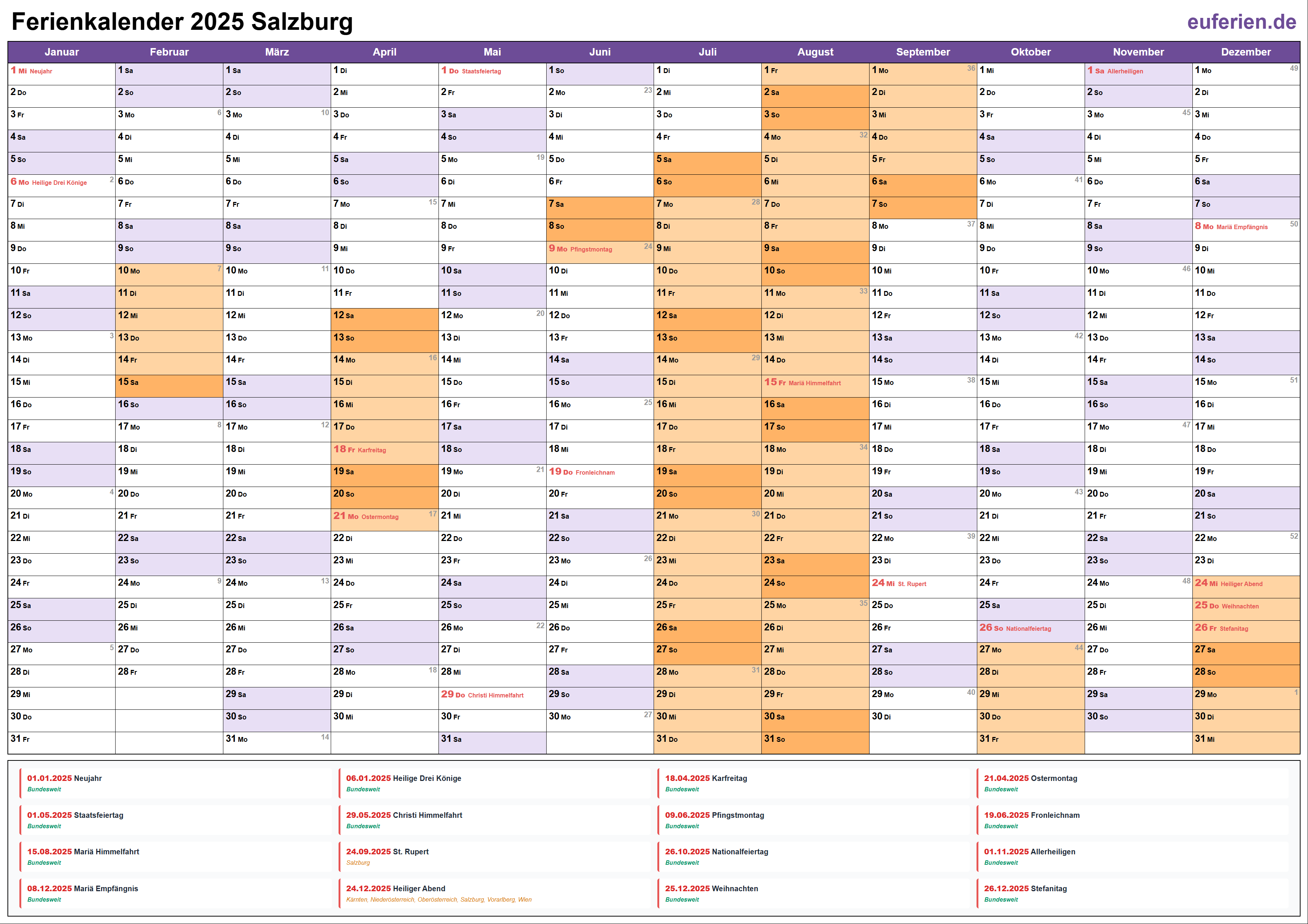 Ferienkalender Salzburg 2025 herunterladen