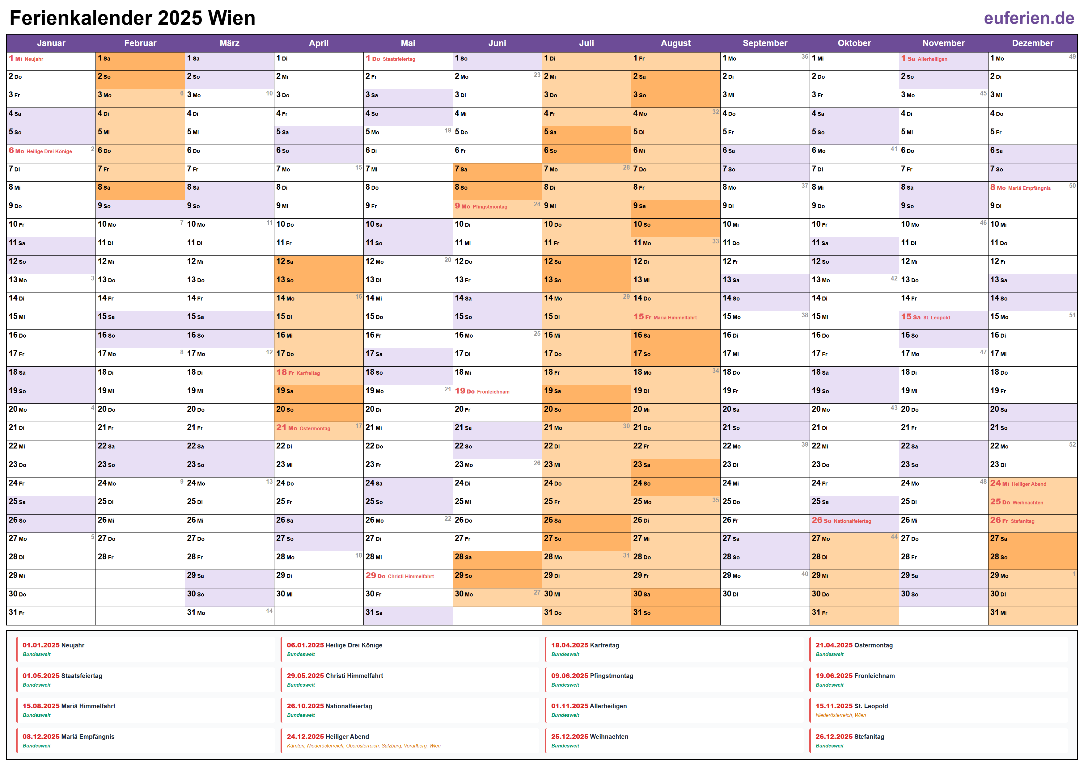 Ferienkalender Wien 2025 herunterladen