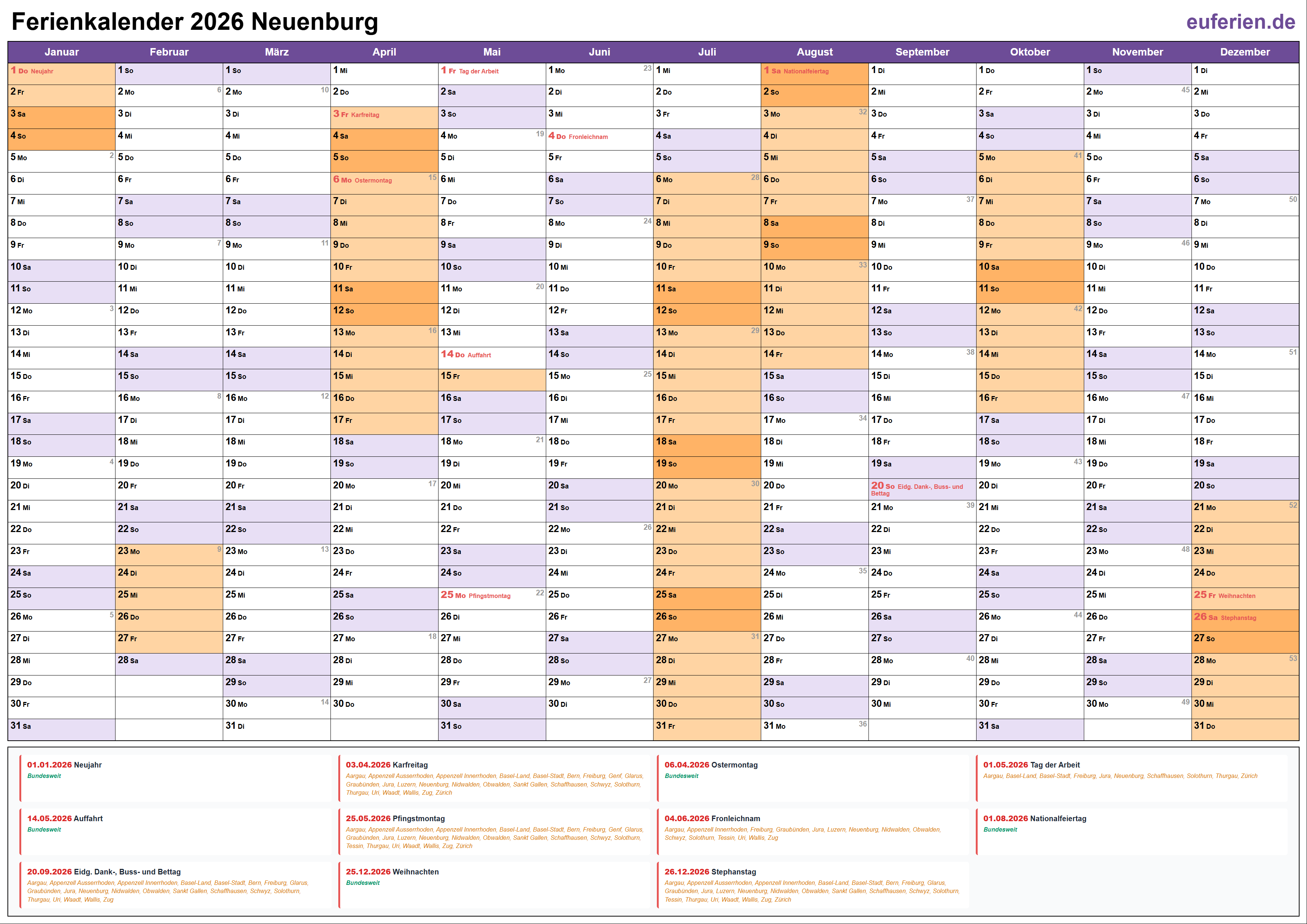 Ferienkalender Neuenburg 2026 herunterladen