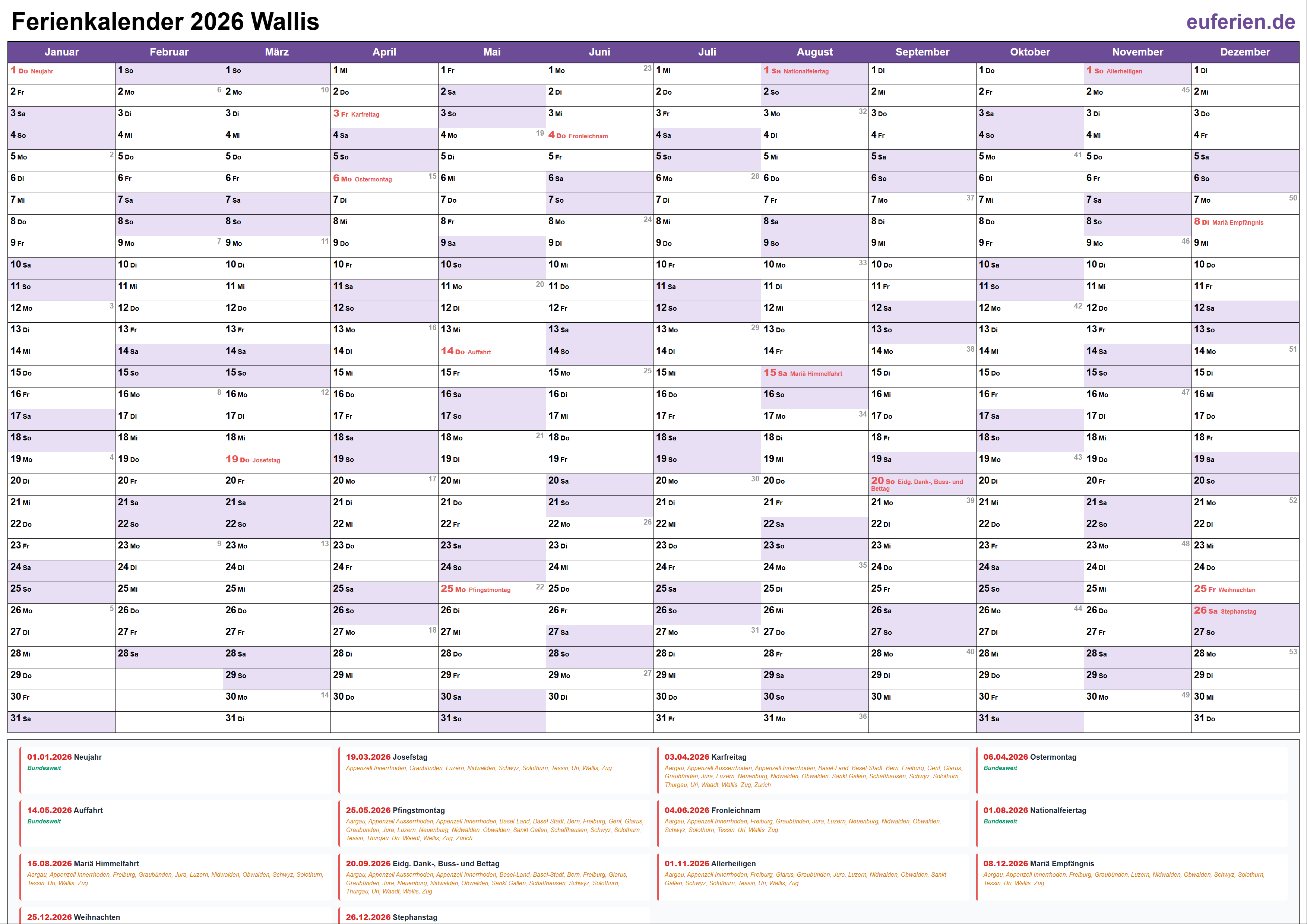 Auf dieser Seite finden Sie alle Schulferien in Wallis sowie die gesetzlichen Feiertage 2026 übersichtlich dargestellt. Der Ferienkalender zeigt Ihnen alle wichtigen Ferientermine für Schulen, Familien und Berufstätige.
