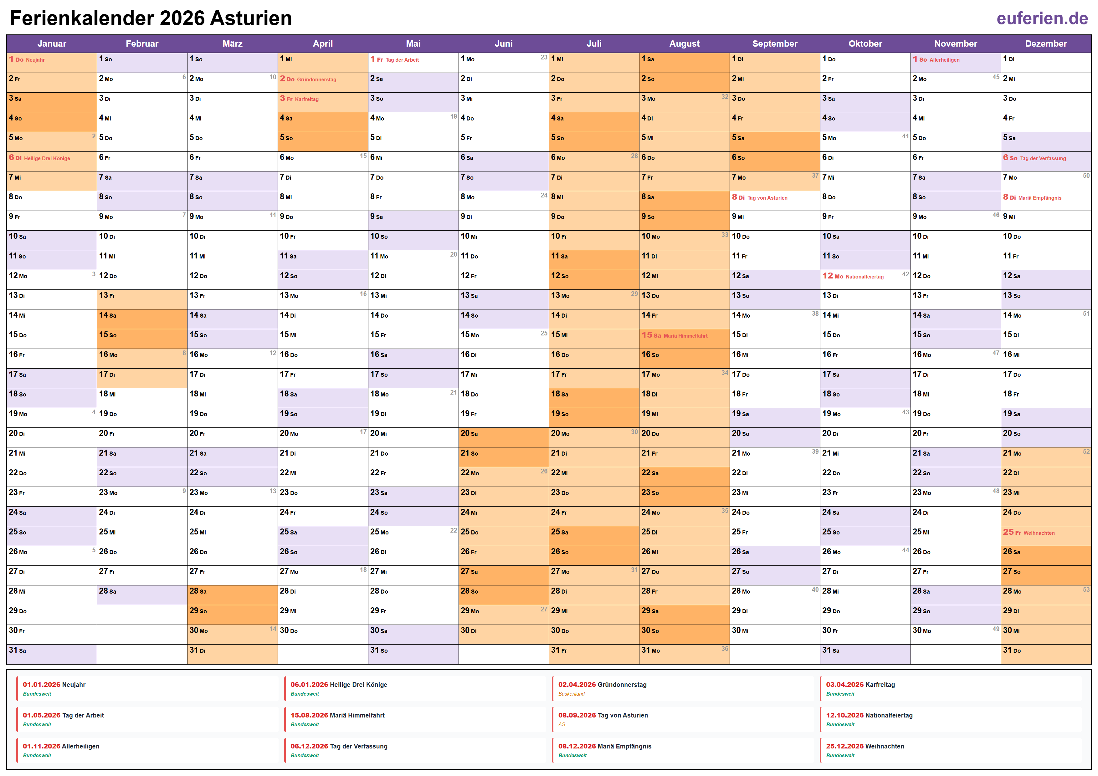 Auf dieser Seite finden Sie alle Schulferien in Asturien sowie die gesetzlichen Feiertage 2026 übersichtlich dargestellt. Der Ferienkalender zeigt Ihnen alle wichtigen Ferientermine für Schulen, Familien und Berufstätige.