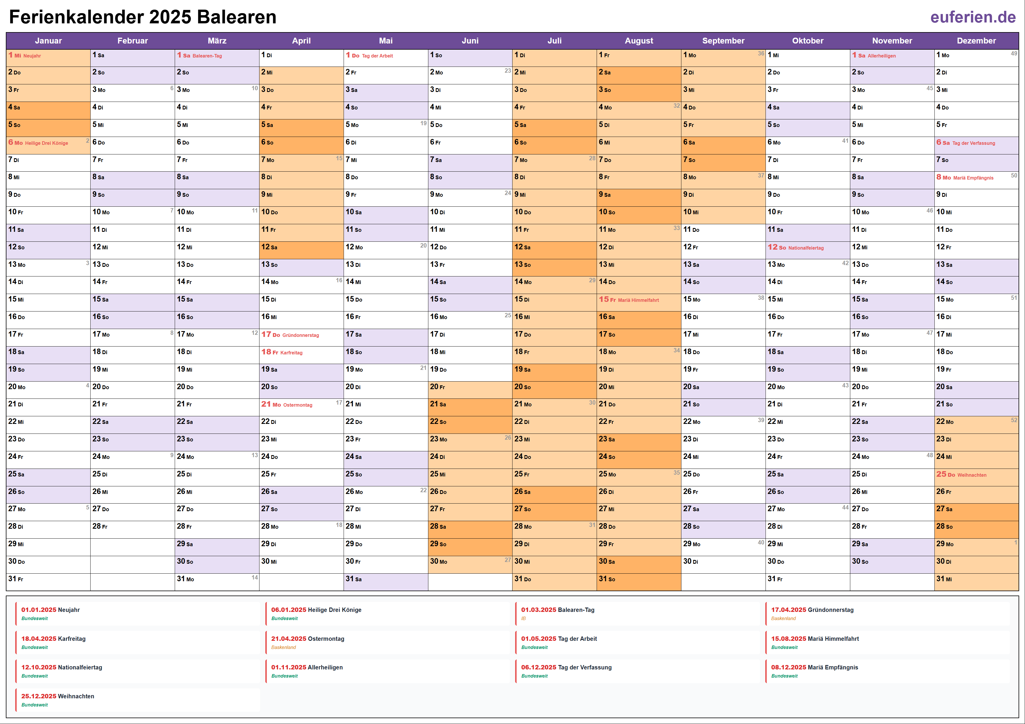 Ferienkalender Balearen 2025 herunterladen